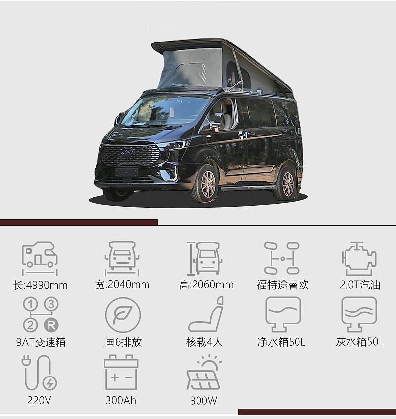 水电方面,新车搭载50L净水箱、50L灰水箱,300Ah电池组+2000W逆变器+300W太阳能组将为车内提供用电支持。厂商还提供包括50L副净水箱、520Ah电池组等选装方案。