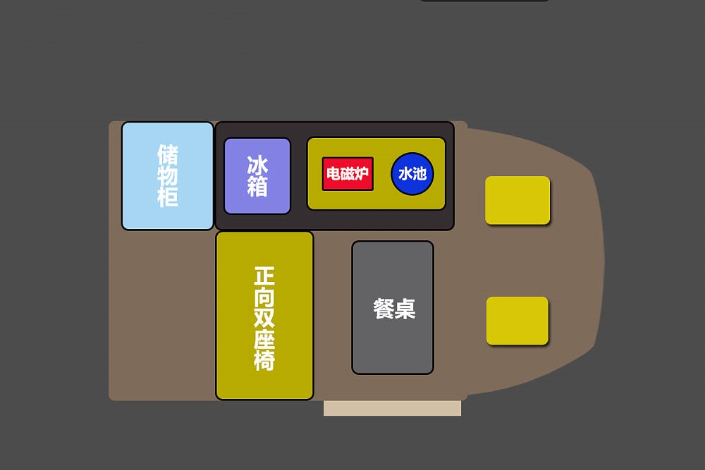 储物方面,厨房区顶部设计了三个顶柜,座椅后方的储物柜也能存放行李物品。