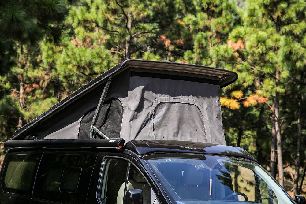 采用斜升顶结构,顶部铺设有太阳能板,我们熟悉的大众加州露营车就是类似造型。进入车内,升顶结构内置一张双人床铺,软顶四周的篷布支持打开,可为内部进行通风采光。