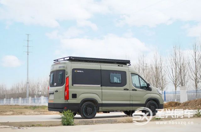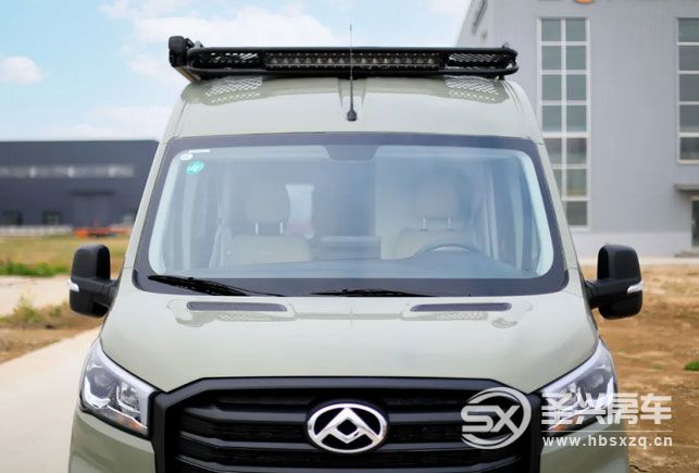 为了更适合户外野营生活,这款车还配备了2800X1700mm定制的行李架和侧面爬梯架,车顶行李架集成了200W太阳能电池板和LED高亮度射灯。