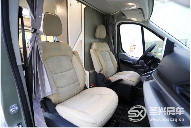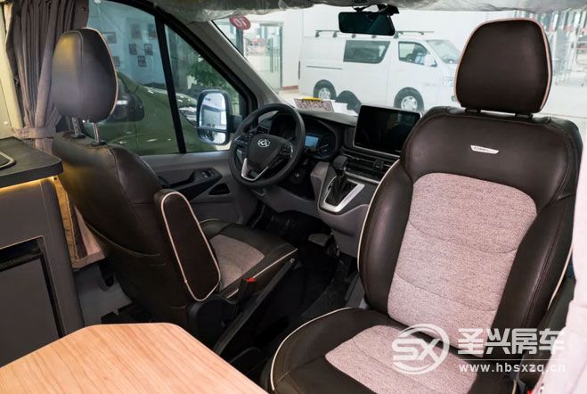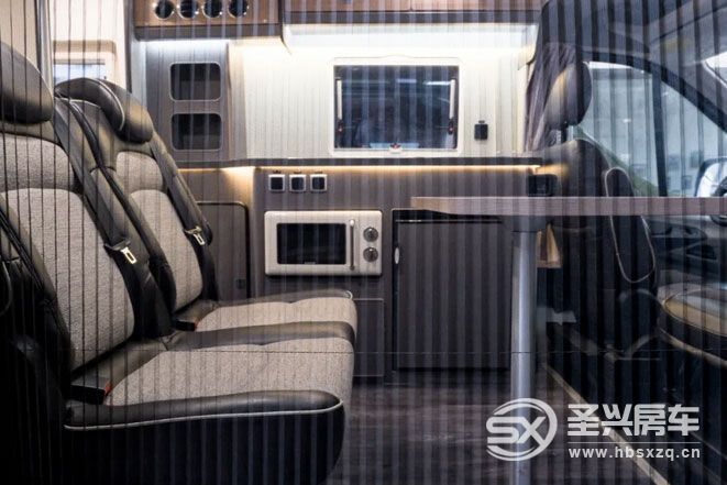 多人会客/就餐区:这款车的入门处是双人乘用车专用座椅(带预紧式安全带),前方有富足的活动空间,驾驶座椅向后旋转,搭配可移动升降餐桌,容纳四人的聚会、工作。