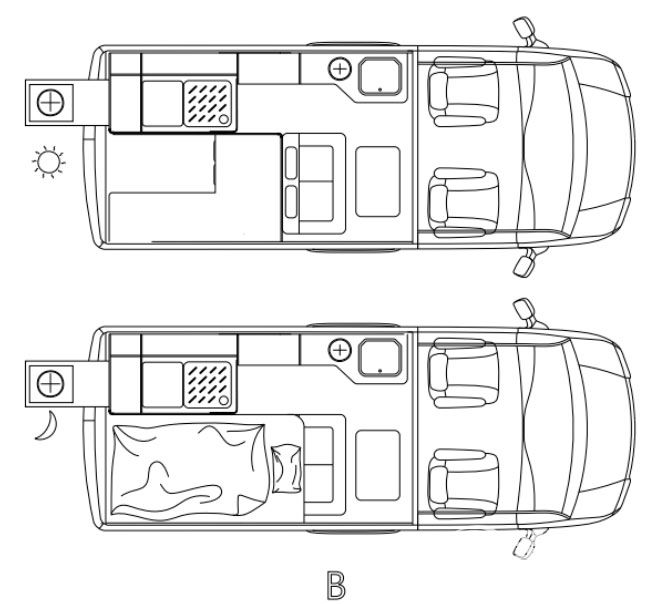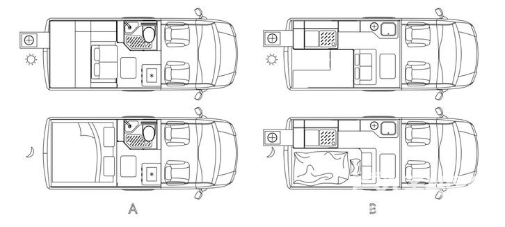 当然,上装设计不仅局限于以上介绍的布局,为让房车爱好者有更好的体验,以下两款布局可选。A版是大横床的设计,B版是纵床上下铺的布局。