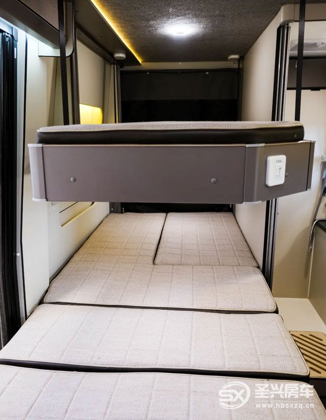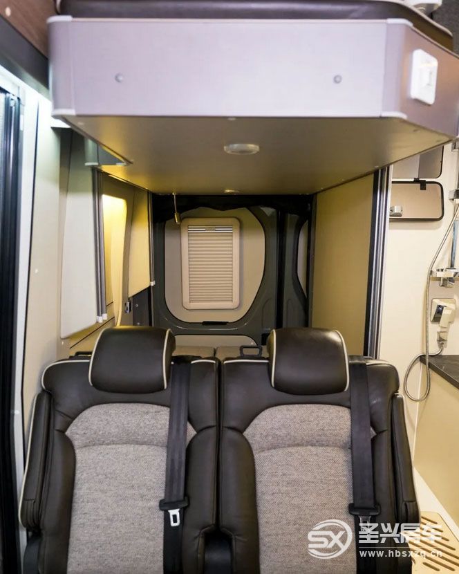 储物/睡眠区: 白天是双人座椅,晚上座椅放倒,与后方床铺形成2050×1100(mm)的常态床,上铺是2000×1000(mm)电动升降床。下方是大尺寸储物空间。