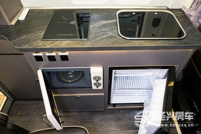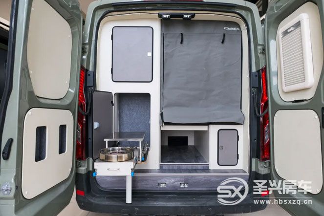 因为空间有限,想要宽敞的空间合理的设计,这款车将会客区、室内厨房区、户外厨房、储物柜的空间进行了合理的融合,并呈现出舒适的审美设计。