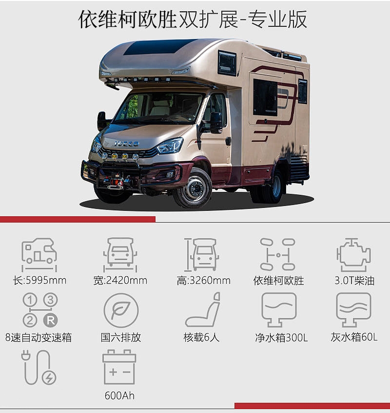 整车尺寸为5995x2420x3260(mm),轴距为3300mm,轮胎尺寸为225/75 R16LT,动力系统是代号F1CE8481K的3.0T柴油发动机,最大功率为125千瓦,峰值扭矩为400牛·米,并满足国六排放标准,具有低速高扭、低油耗、低噪音、低排放等优点,与之匹配的是8速自动变速箱,可以实现平顺的换挡和优化的动力输出。