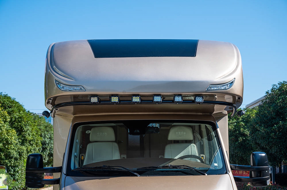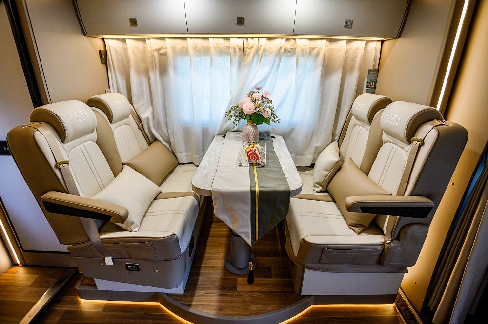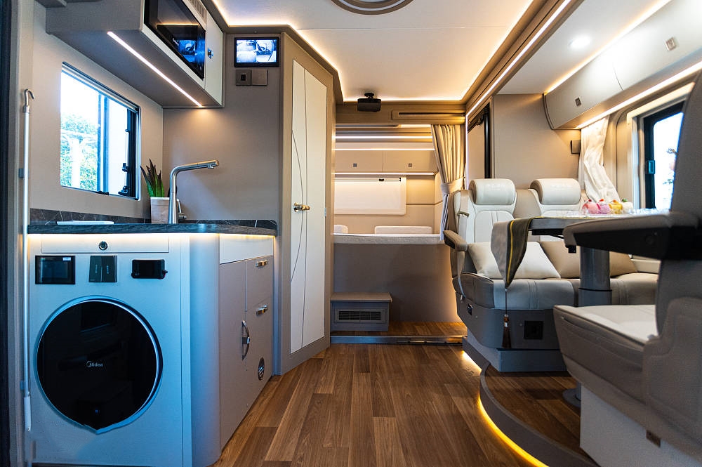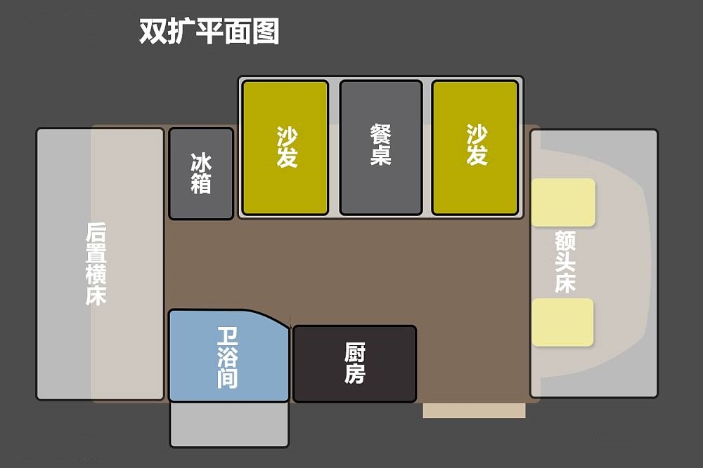 从前到后的布局依次为驾驶室+额头床、会客区+沙发床、厨房区、卫浴区以及后置拓展横床,布局形式充分利用大尺度车厢空间,整车内部空间宽敞舒适,可满足六人在车内同时起居,各项功能区的划分也比较规整。