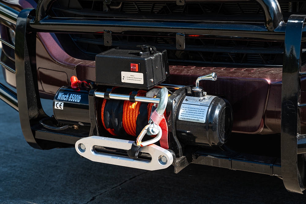 粗壮的车头保险杠搭配硕大的8500磅电动绞盘,无时无刻不在彰显整车力量感,在野外恶劣的环境中,如沙漠、沼泽、泥泞、雪地等,更能够帮助塌陷车辆脱离困境。