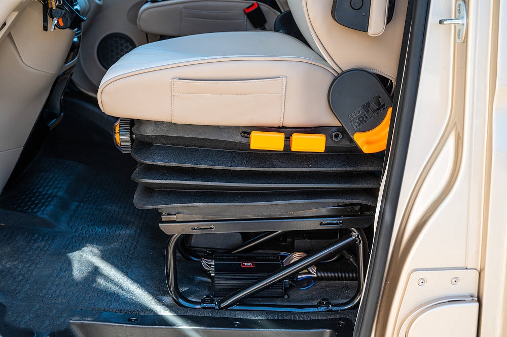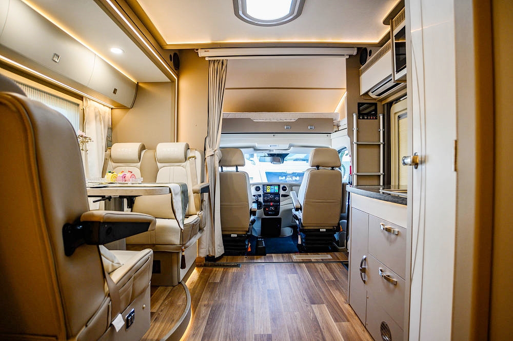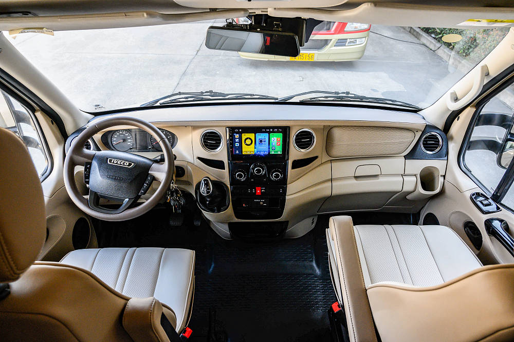 主副驾座椅均配备了悬浮座椅减缓长途驾驶疲劳,驾驶辅助方便配置完备,配有ABS防抱死系统、四轮盘式刹车、倒车影像+行车后视监控等,为驾驶提供了全面且可靠的保障,使房车旅行变得更加安心舒畅。