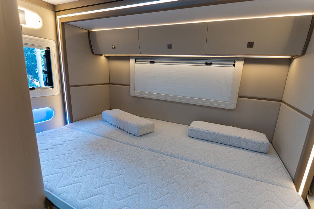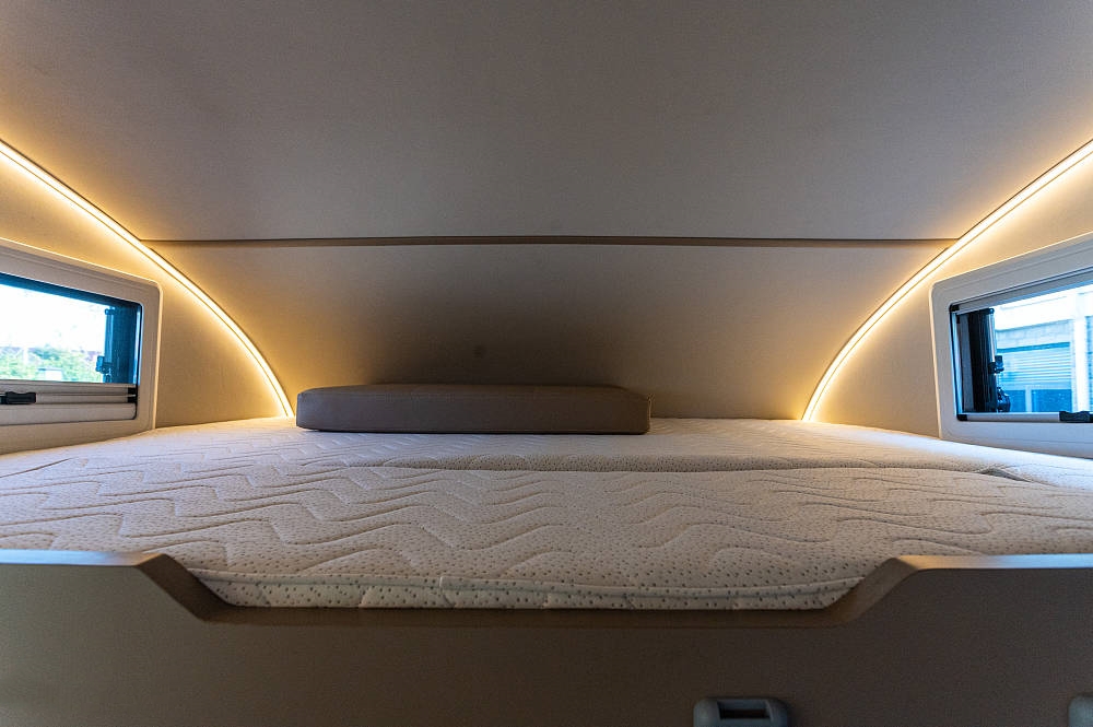 额头床为抽拉式床板设计,白天不使用收起来后驾驶室在垂直方向更显通透敞亮,两侧各配有一个外推窗,保证采光和通风效果,原车附送的高密度海绵床垫睡感舒适。