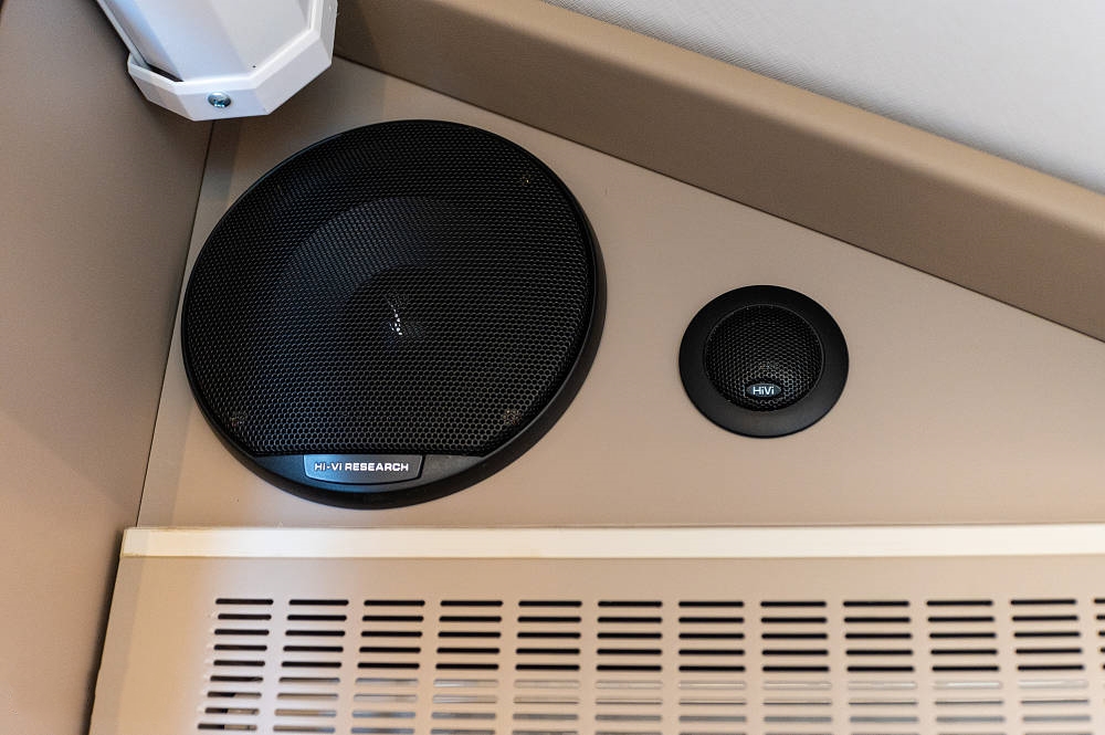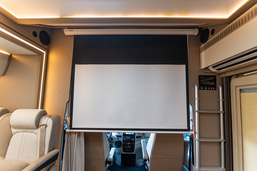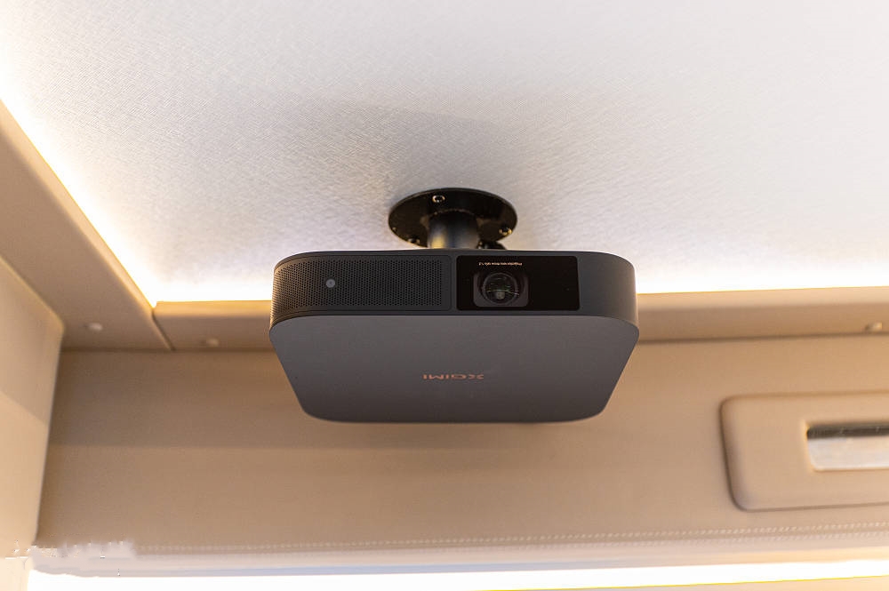得益于双拓展的宽大空间尺度,车厢配备了一套投影设备作为娱乐配置,包括极米投影仪和60英寸幕布;音响视听方面,欧胜房车没有吝惜成本,提供惠威车载音响。