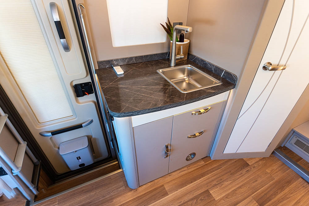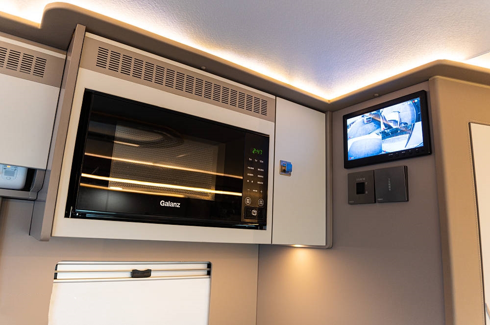 厨房区台面内嵌有不锈钢洗手池与与全尺寸龙头,左侧操作空白区域搭配随车电磁炉和上部微波炉,可快速加热餐食、制作简餐更加便捷快速。