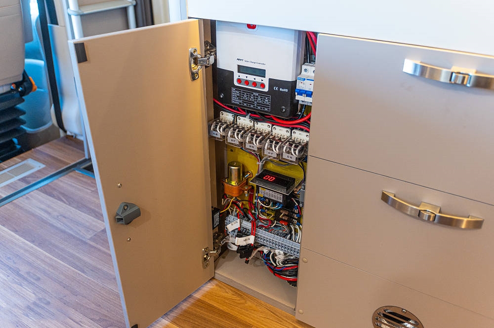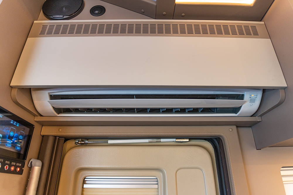车厢进门上方吊柜中内嵌有一台家用变频空调,应用在房车这样面积可控的空间内,可快速安静的调控车内温度,避免忍受酷热夏日较长时间的降温过程。