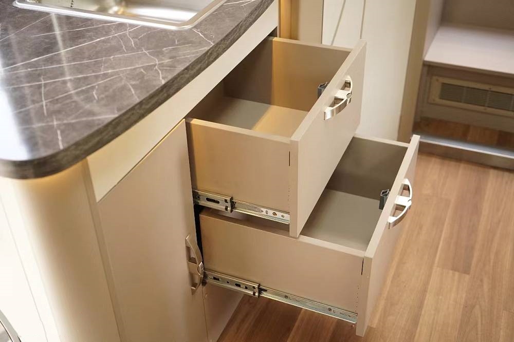 台面下方可选装2.8kg洗衣机,由于会占用一定橱柜空间,所以电路检修区设置在了橱柜内部,此外,储物柜的多层抽屉也经过精心设计,提供了充足的收纳空间。不同深度的抽屉方便分区放置厨房用具、餐具以及各种食材调料