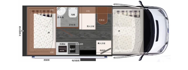 内部装饰特点:全顺旅居车从内部来看就是一间小小的套房,餐桌、料理台、双人床、洗漱间等一应俱全,配上靓丽的色彩设计,令人心情愉快的同时,充分享受源于房车的轻松与便捷。料理台紧靠车窗,在阳光下享受烹调的乐趣,实用的餐桌,对面即是电视纤巧实用的冰箱,存储饮料或者食材都很不错 。右侧车顶位置设置遮阳蓬,选装车顶空调,车身外部喷涂或粘贴外观标识。