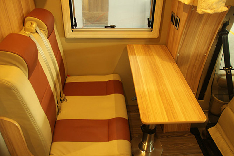 起居室的前部分是一个简单的沙发和小餐桌,同时正副驾驶座椅可以向后旋转,与后面的桌椅形成一个小型的会议室。小餐桌可以进行升降,当将至最低处时,可以在此处拼合成一个简单的躺椅。