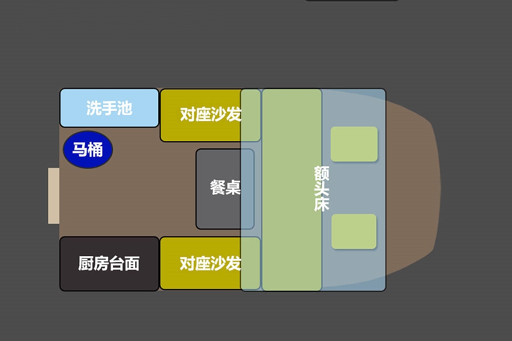 生活区内部由额头床、对向卡座、厨卫区组成,内部只能在驻车休息时使用,行驶中不能载客。内部整体风格清新宜家,针对整体布局来说更适合2人左右的旅居需求。
