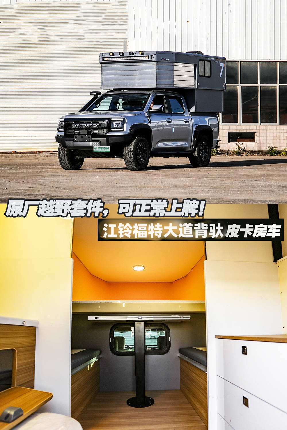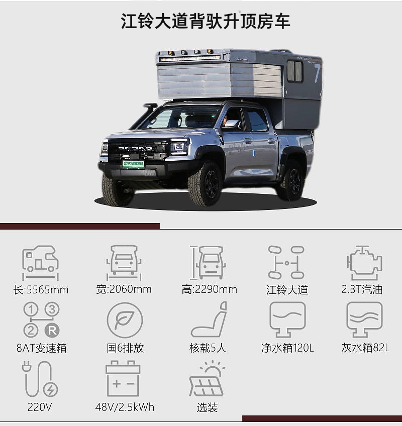 皮卡房车的好处有很多,比如自身带有四驱系统,可以适应非铺装路面;相比常规底盘来说,皮卡房车车身高度适中,一些城市路段也能正常通勤。江铃大道底盘打造出了一台背驮式升顶房车,越野性能强悍、实用性高。