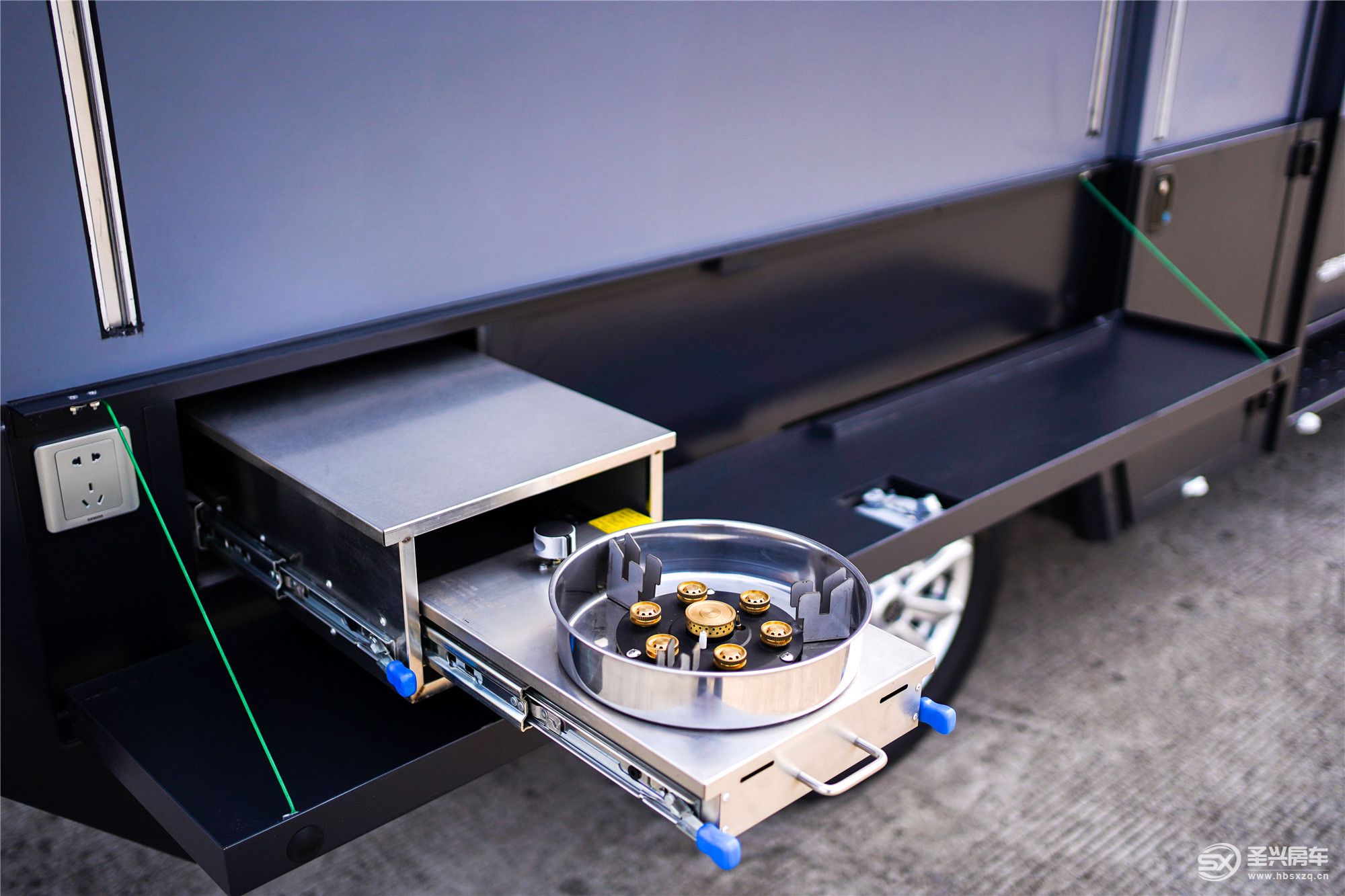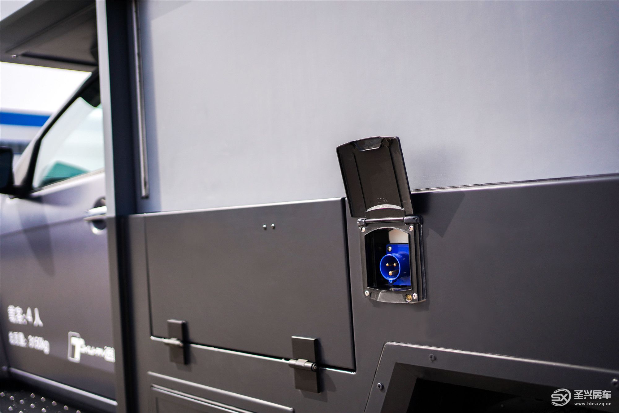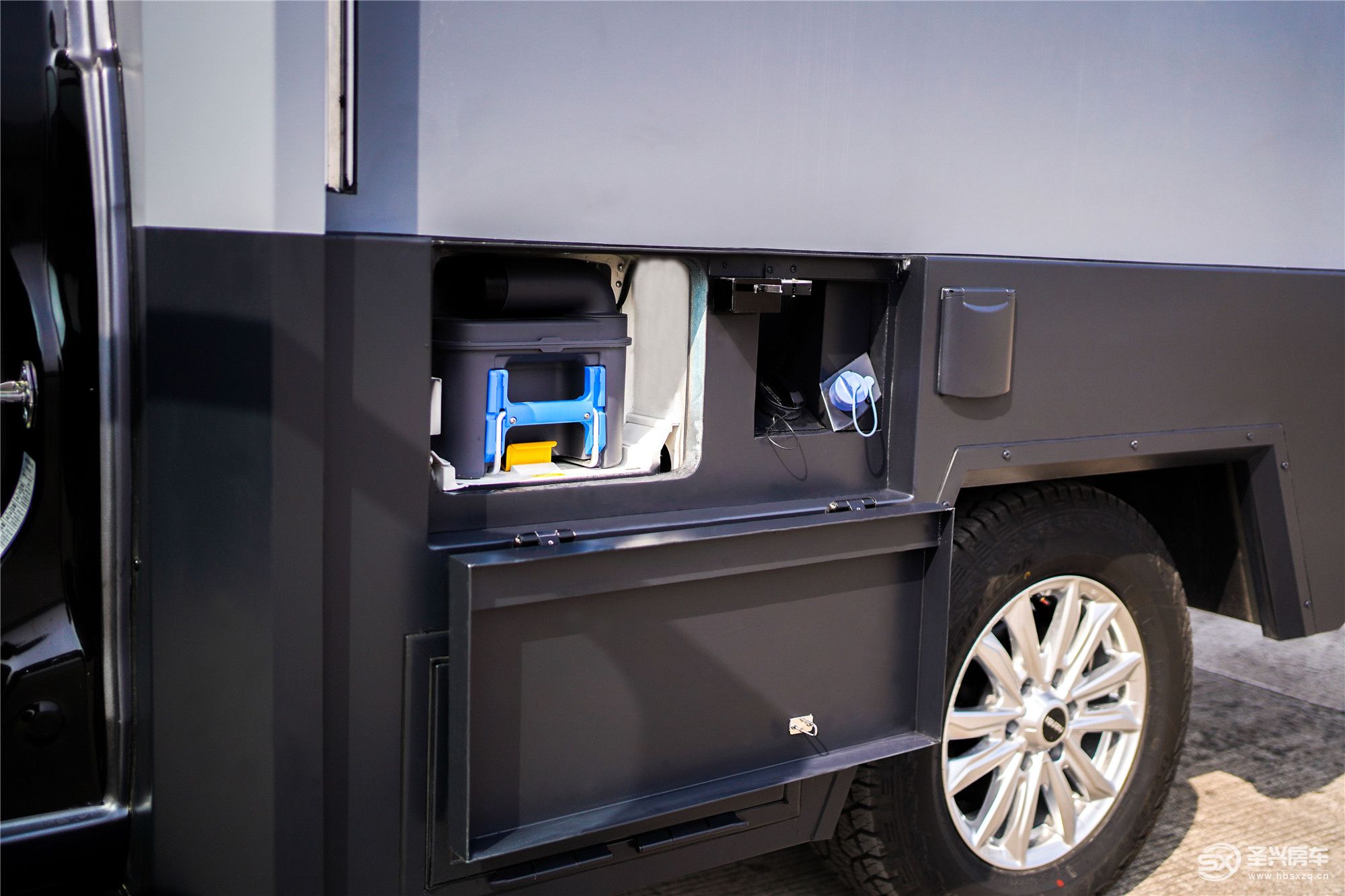 车身外侧配备了丰富的户外生活设施,包括户外遮阳蓬、全铝踏步、外部抽拉灶、电源插座、220V充电接口、重力注水口等;顶部还设置了户外照明灯,满足户外生活照明所需。