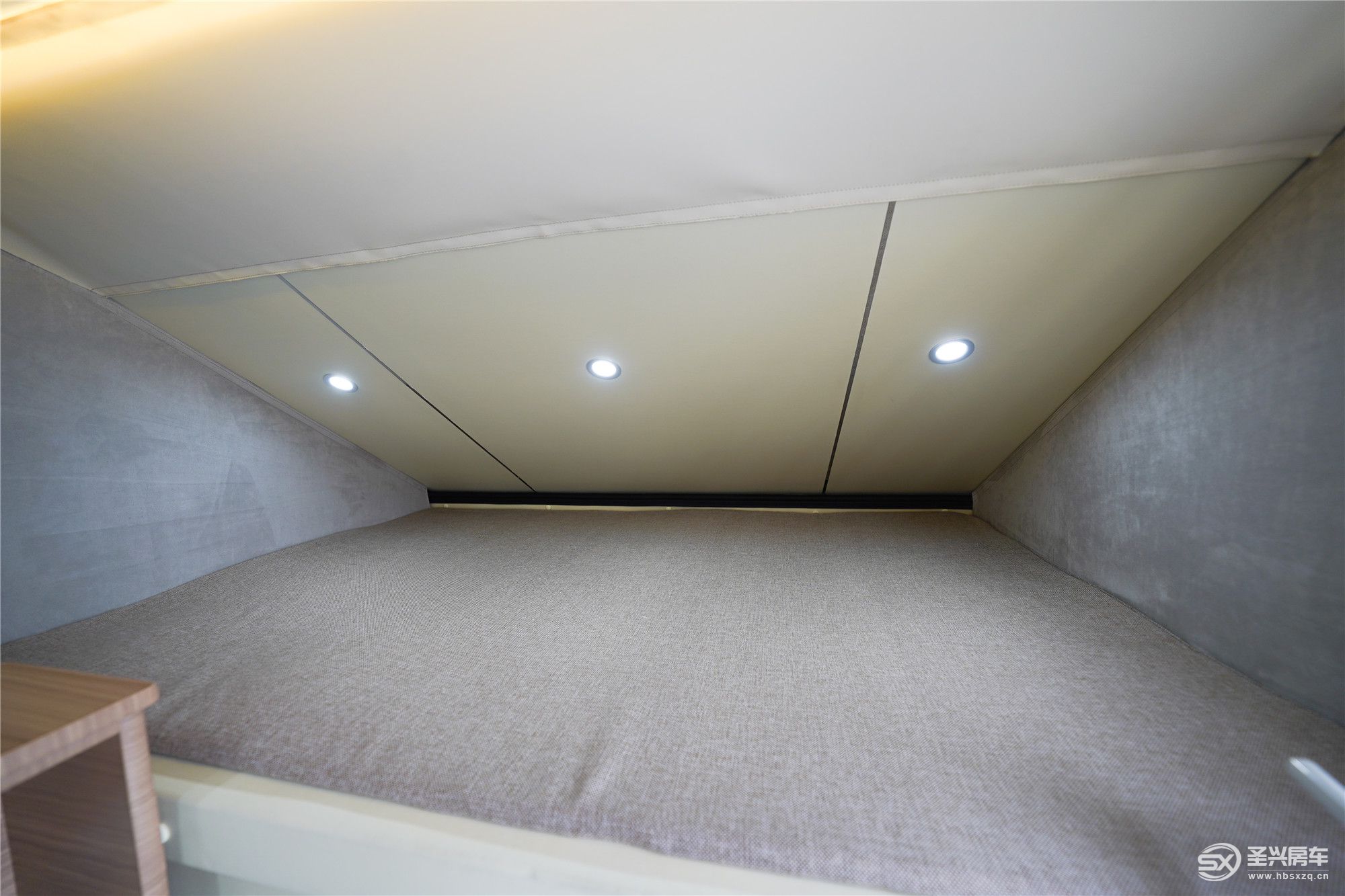 额头床的位置在驾驶室上方,打开升顶机构后,一个充裕的睡眠空间就展现出来了;床铺的顶部设置了3个照明灯,解决休息空间的照明问题,电源插座和USB接口设置在下方,可以为手机等电子产品充电。