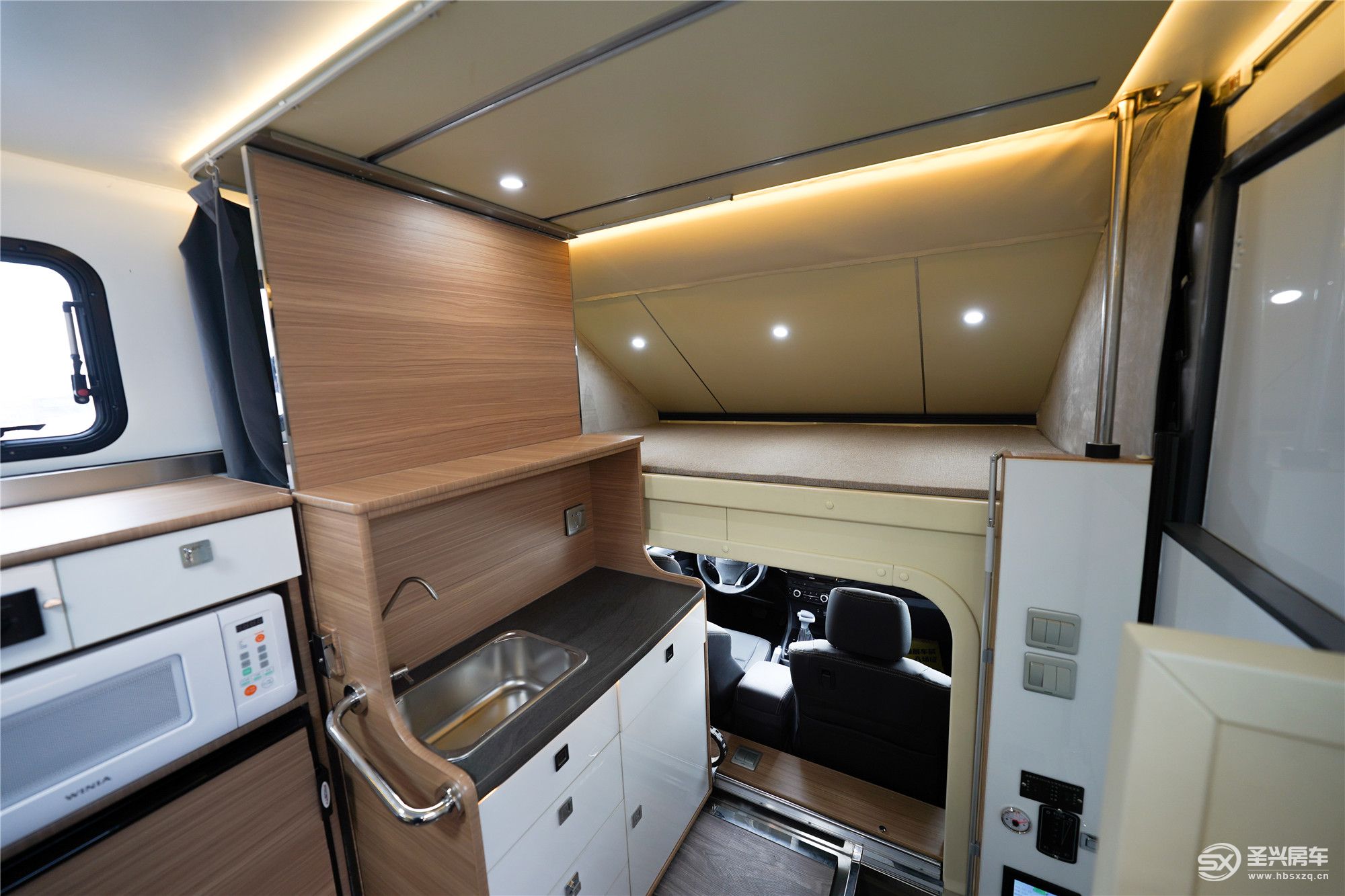 厨房区依旧采用整体式橱柜设计,配备了洗菜池、水龙头、电源插座等设施,左侧还有内嵌式微波炉和88L房车专用冰箱,满足日常烹饪需求;橱柜下方还设置了储物抽屉、橱物柜,用于收纳厨房物品。