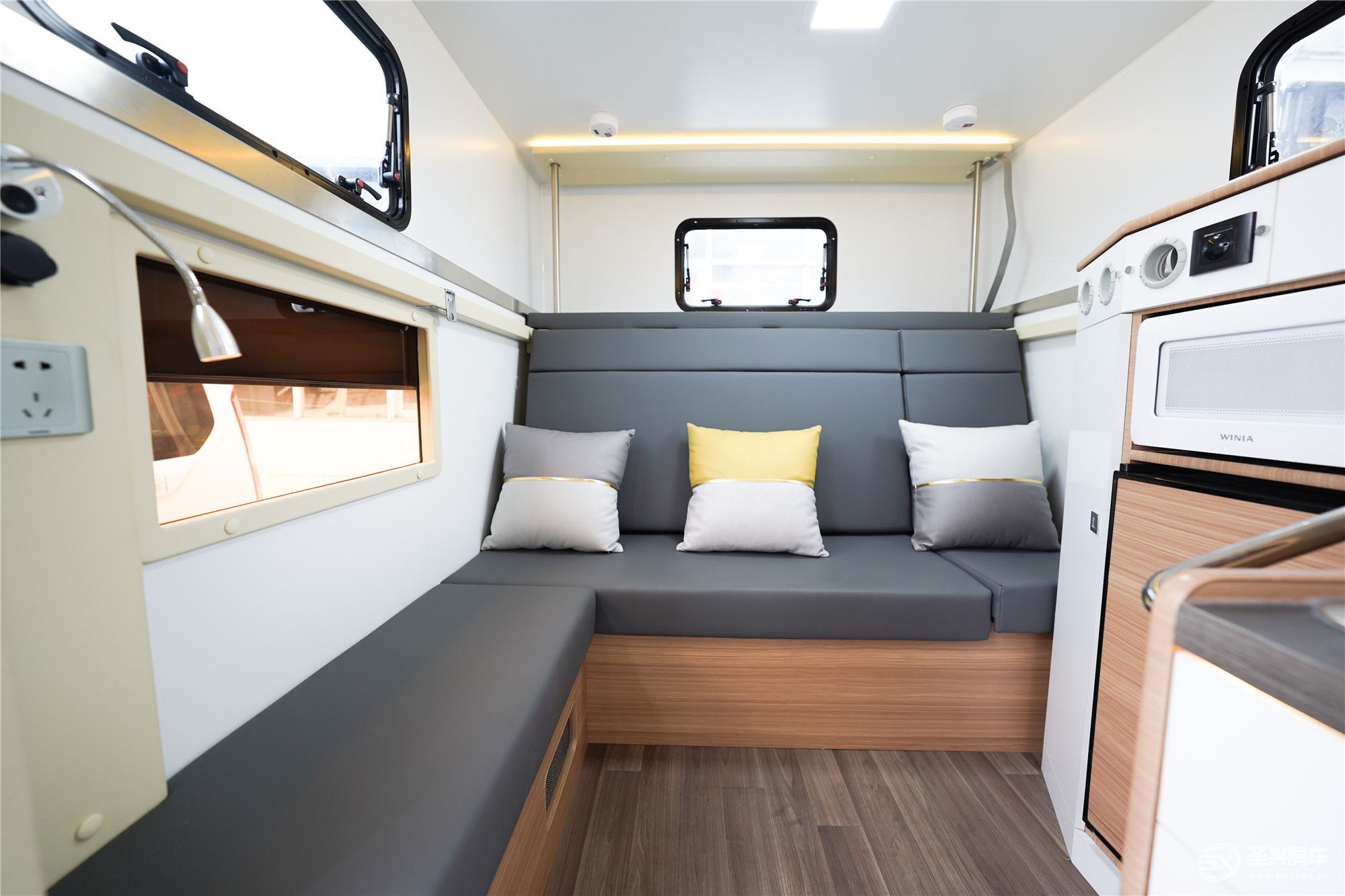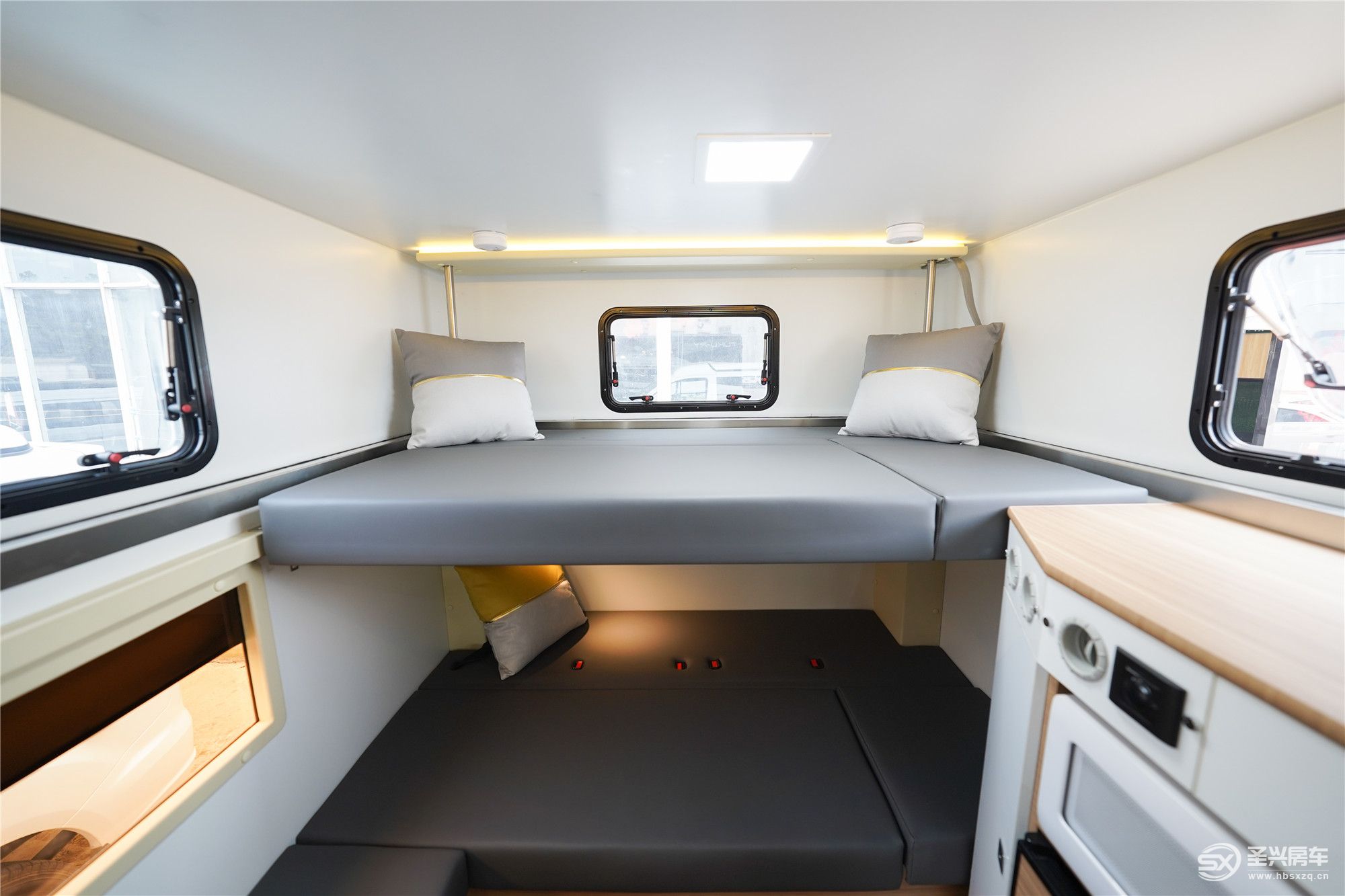 和T70版本不同的是,五十铃D-MAX版的卡座可以拼成两张沙发床,拿下卡座的靠背后,可以在上层组成一张1900x1100mm的床,床铺三面环窗,采光通风非常不错;下铺的坐垫可拼成1900x1000mm的单人床,侧面还配备了照明灯。