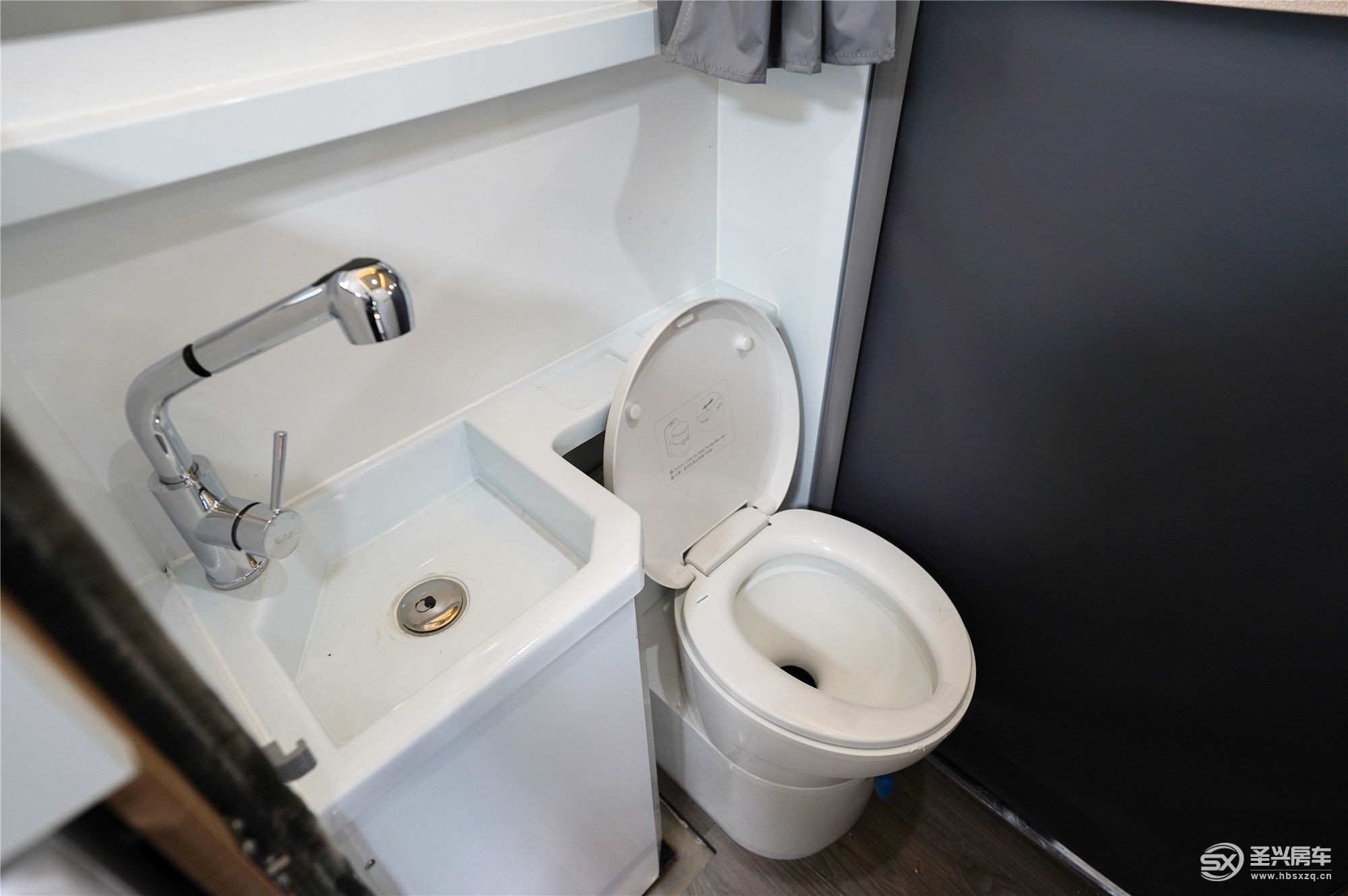 橱柜的底部设有滑轨,可以通过固定把手向前拉动橱柜,后方就是这款房车的位移式隐藏卫生间了;打开卫生间后,可以看到盒式马桶、冷热淋浴花洒、洗手盆、水龙头、化妆镜等设施,轻松解决卫浴、洗漱问题。