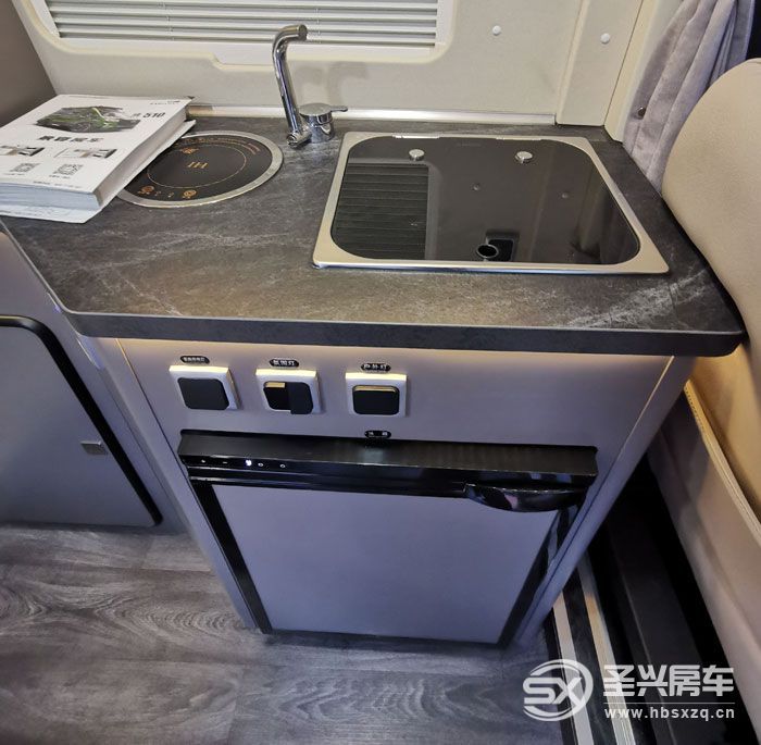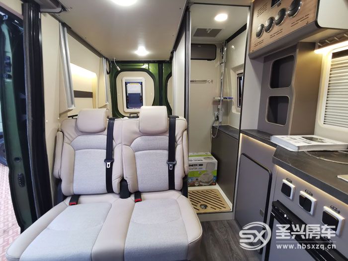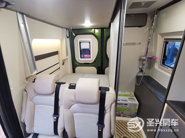 短轴房车内部往往都是采用紧凑型布局,这款也不例外。驾驶舱1+2能坐下3人,后部会客区双人座椅全车荷载5人。前后排座椅中间设计有餐桌,内侧设计为多个功能组合柜,配置也不少,有电磁炉、洗菜盆、65L车载冰箱、上部还有一台24V直流变频空调。