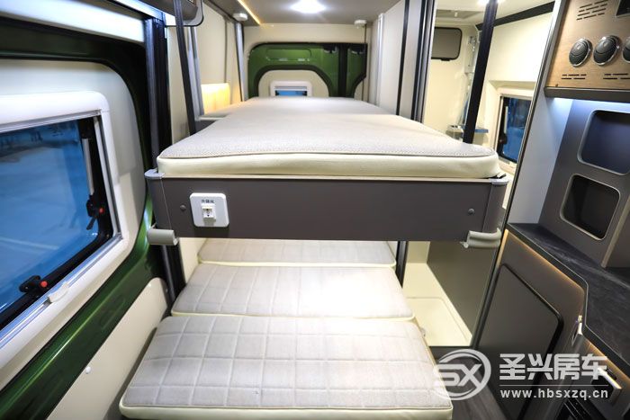 短轴房车想要获得更舒适的休息床位,纵置上下床的设计无疑是个好选择。结合车内第二排座椅可拼成一张尺寸是1900*1000毫米的单人床,上铺是一张电动吊床尺寸是1900*900毫米。综合配置方面:400ah锂电池、200w太阳能、3000W逆变器、入门款为200ah胶体电池及智能房车用电管理系统,同时该车还配有5KW柴油暖风热水一体机、柴油雾化炉等。