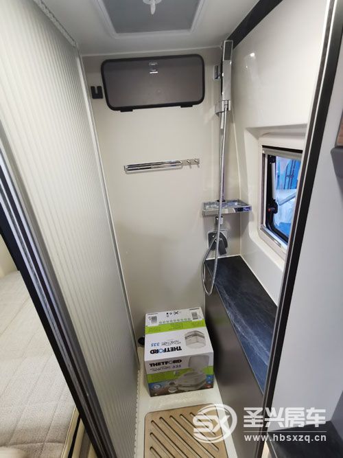 卫生间外部设计有卷帘门,配有便携式马桶、淋浴花洒、毛巾架、侧面有外推出顶部有换气扇。水路系统配有100L净水箱以及50L灰水箱。