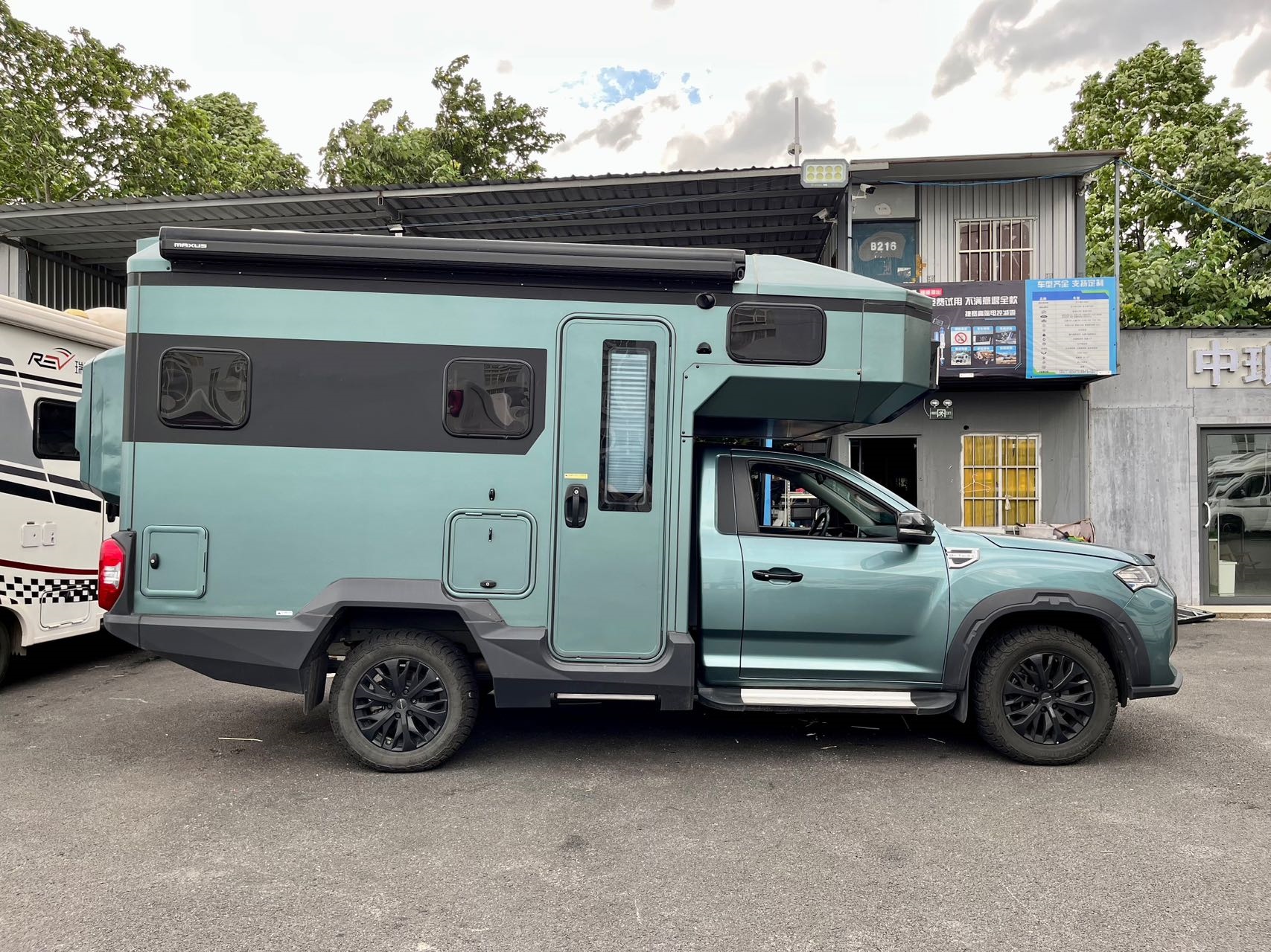 户外配置:户外抽拉式燃气灶,户外遮阳棚,市电接口,重力加水口,储物舱,自动驻车支腿,行李背包。