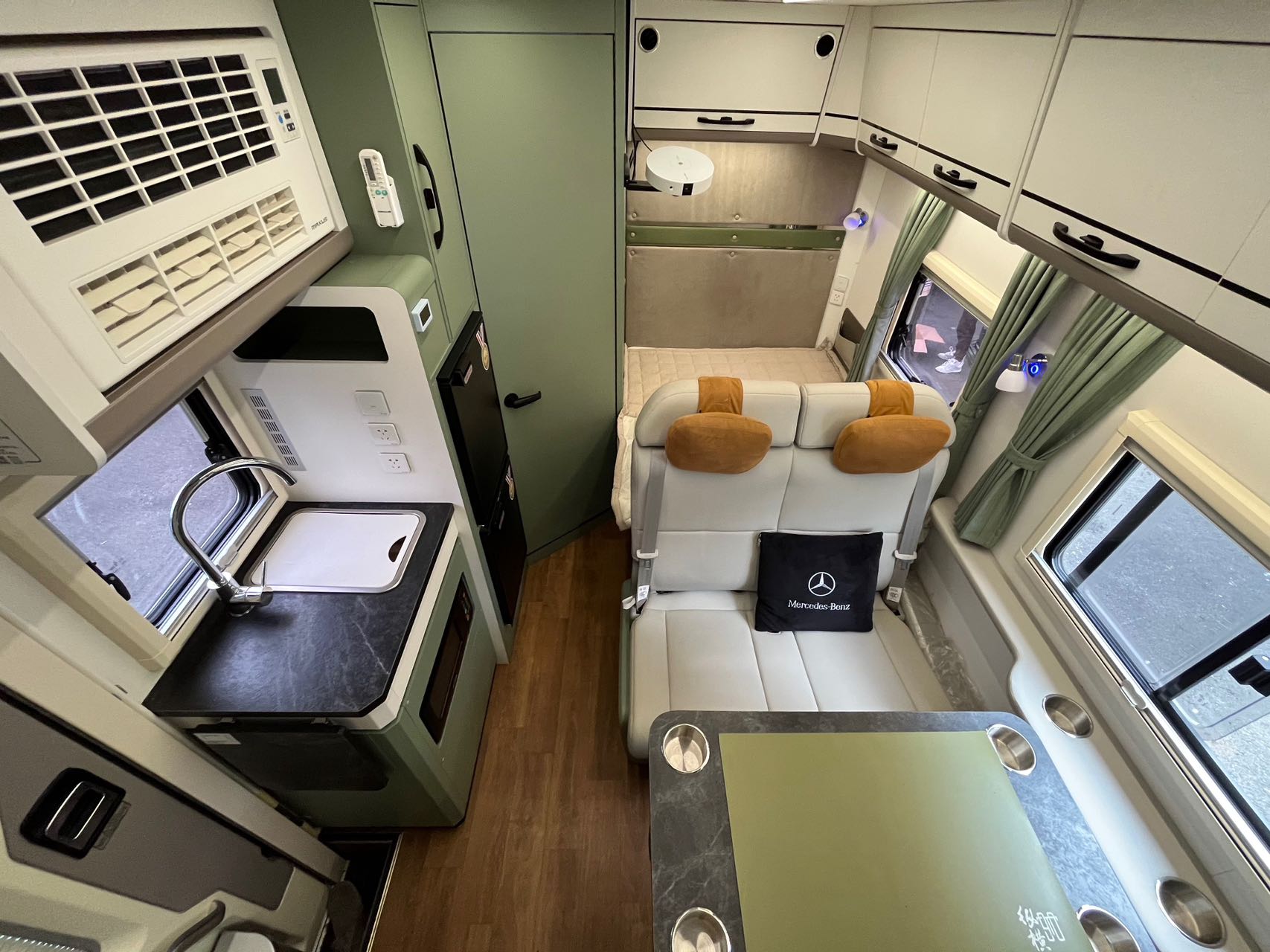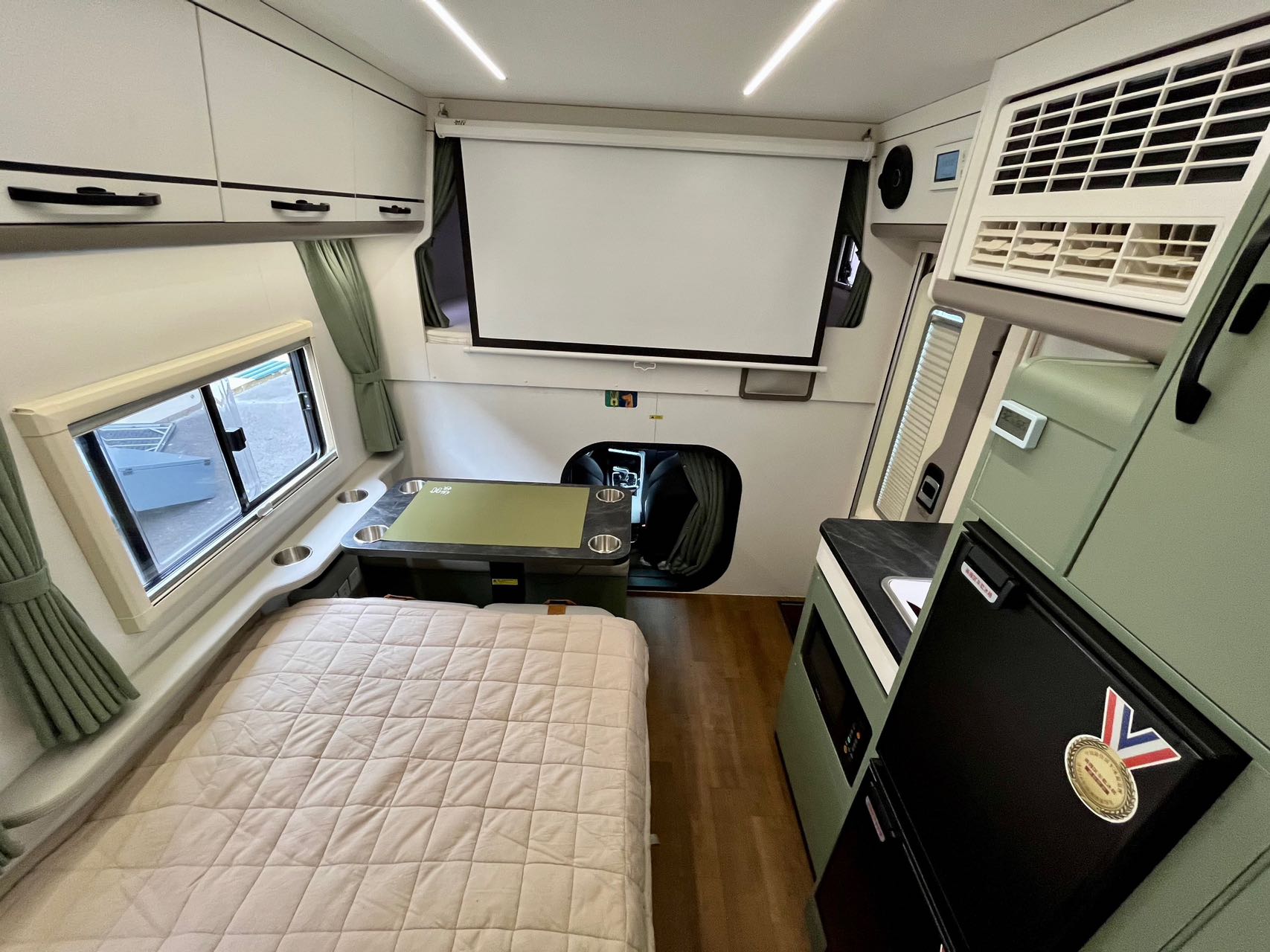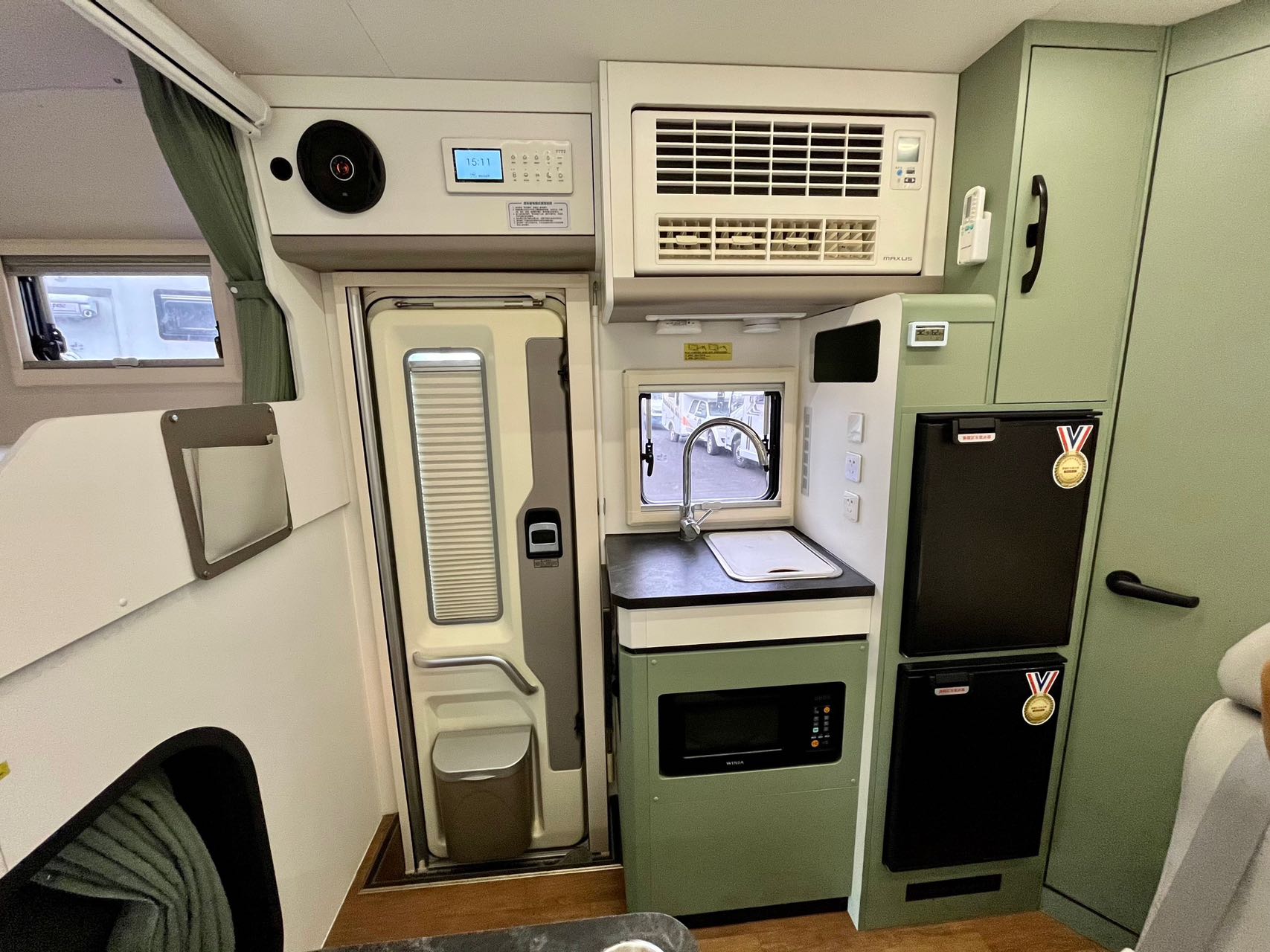电器配置:48伏直流变频空调,英得尔车载冰箱,微波炉,洗水池,水龙头,洗衣机,燃油暖风,投影仪