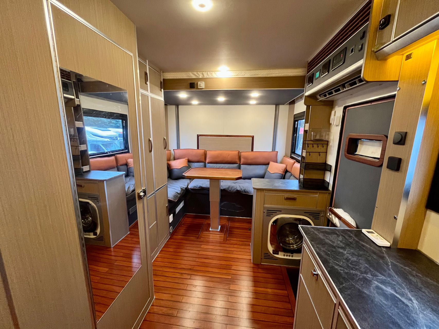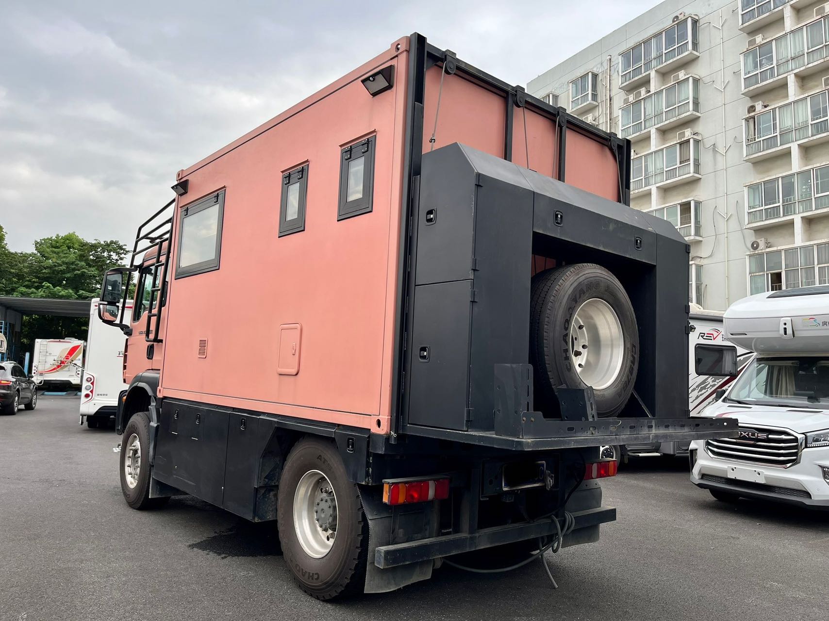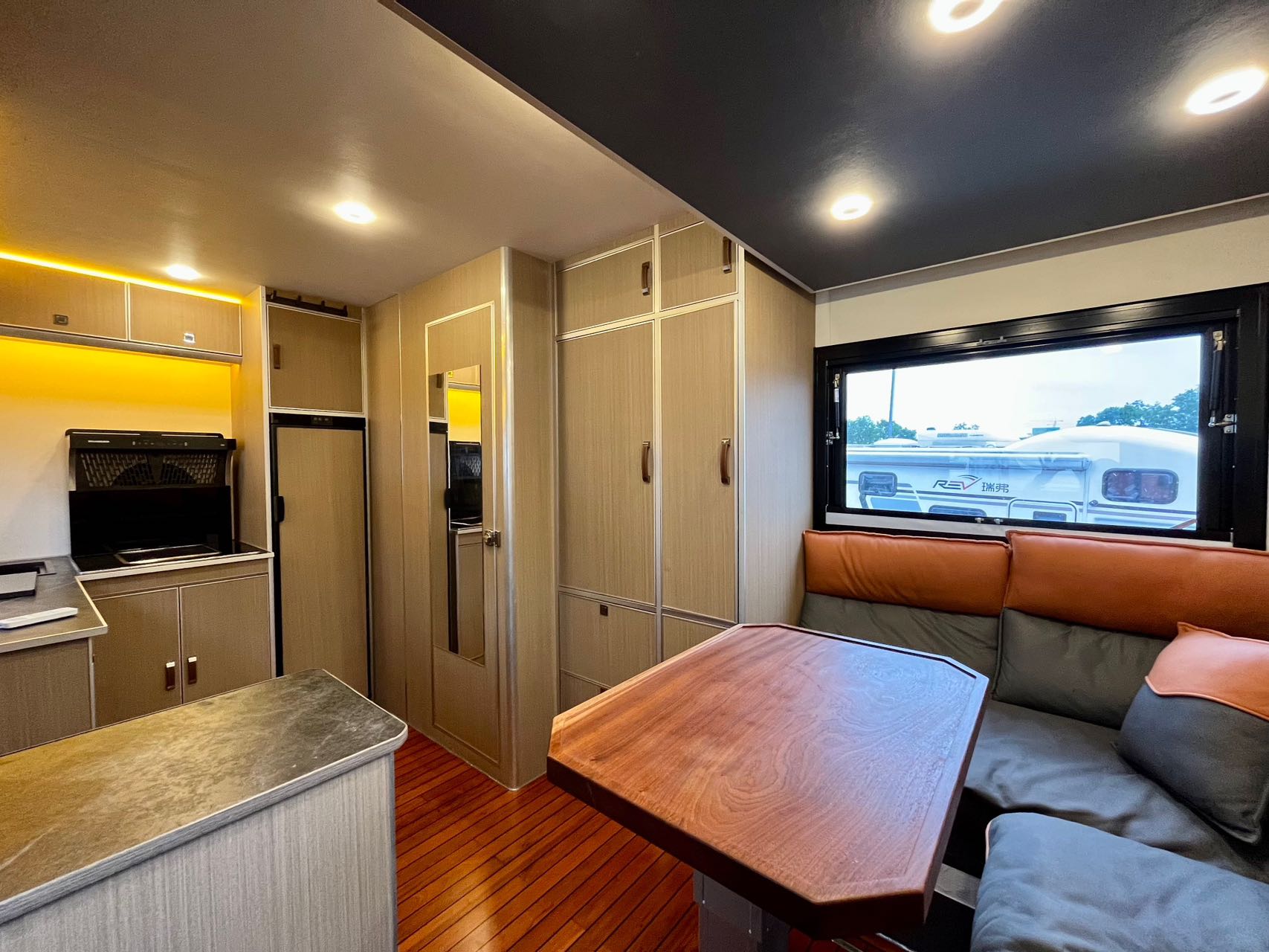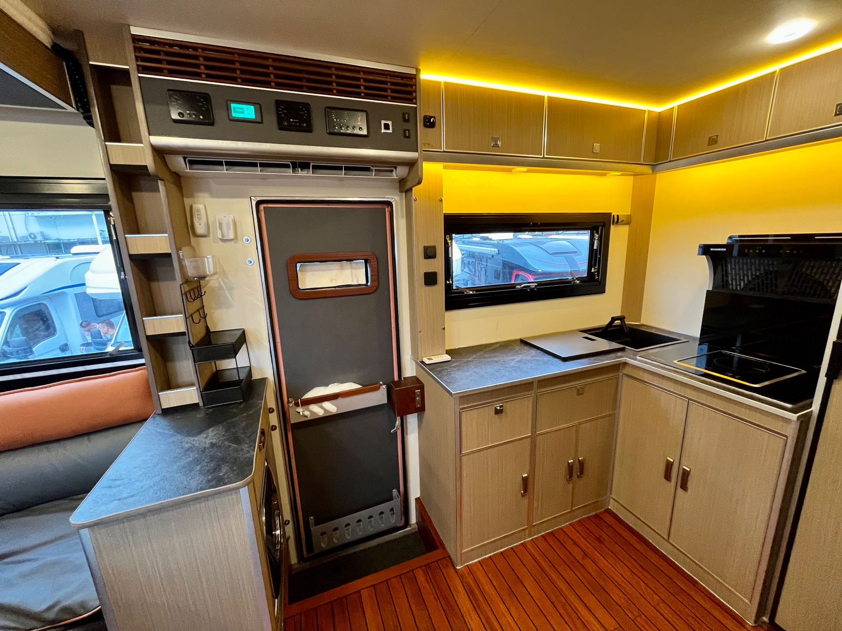 【户外配置】:220V市电接口,重力加水口,电动户外遮阳棚,中门密码锁,五阶上车踏步,电动升降储物箱和摩托车架,车顶射灯