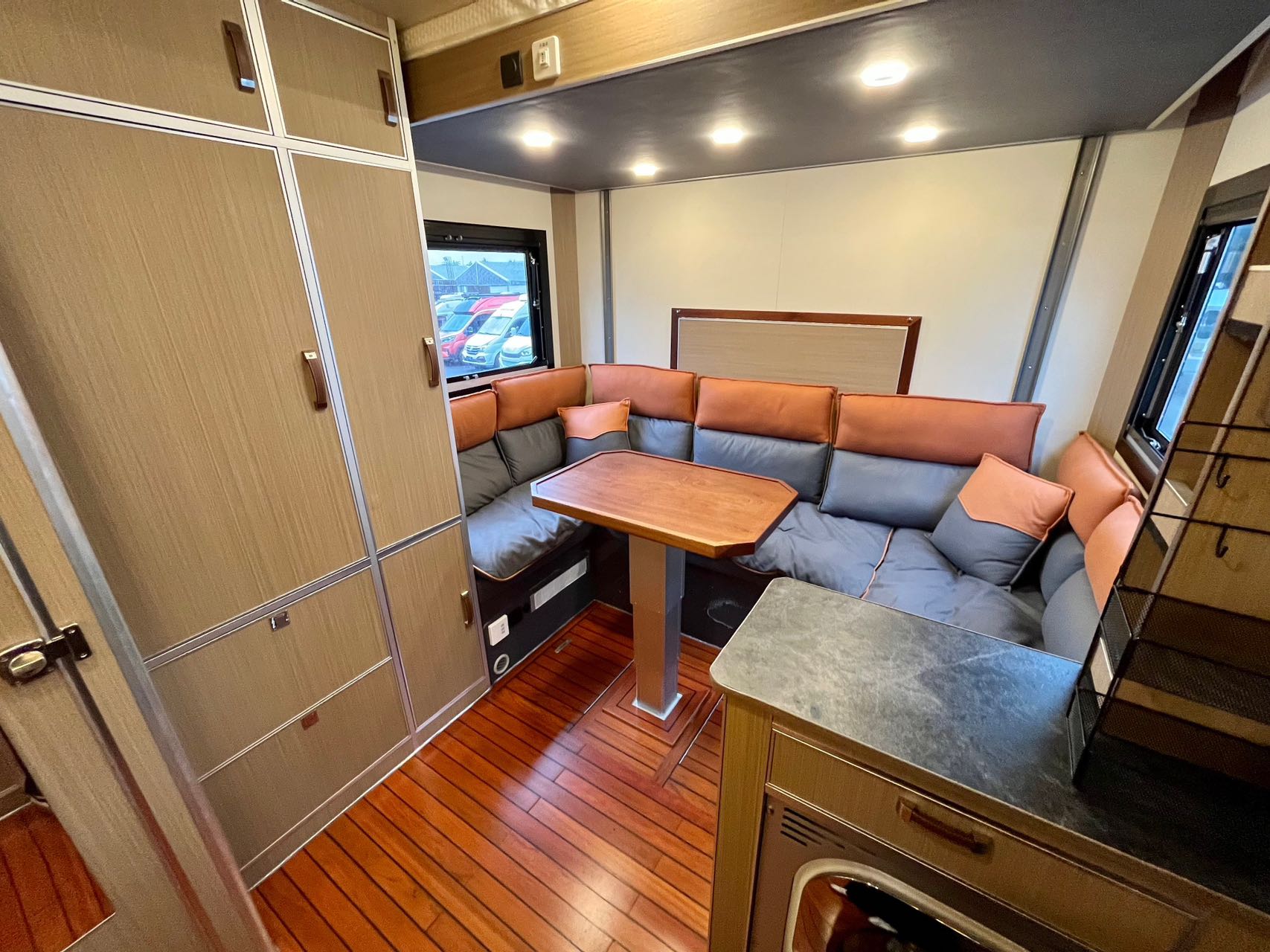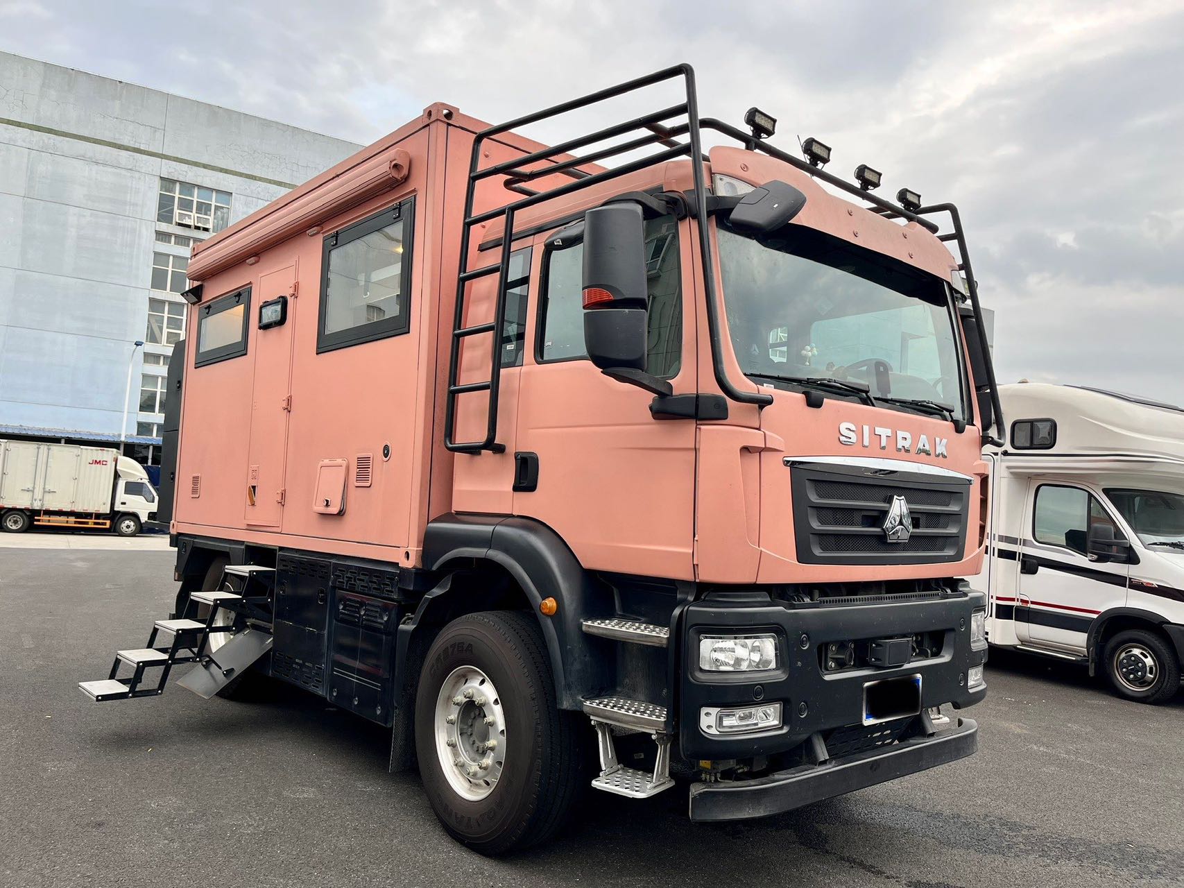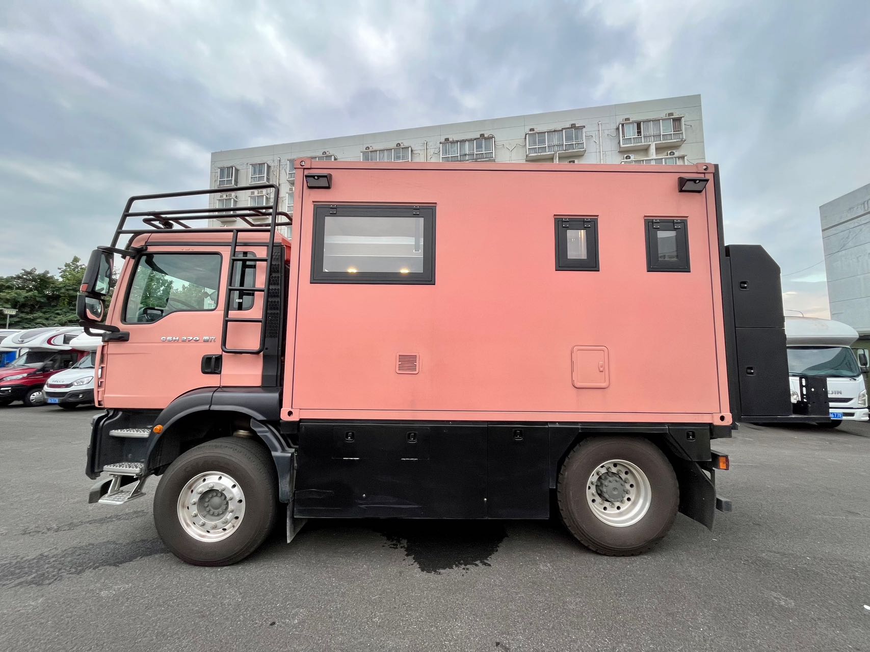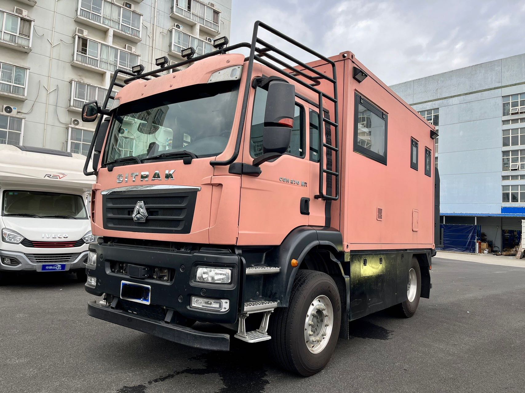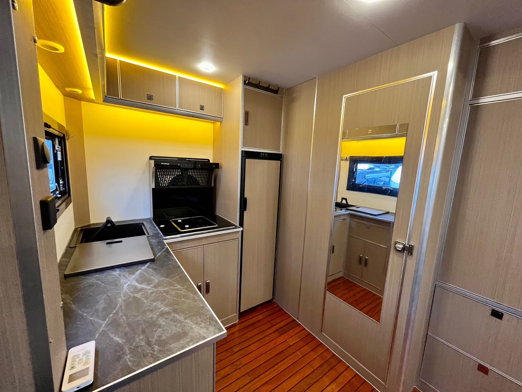 【户外配置】:220V市电接口,重力加水口,电动户外遮阳棚,中门密码锁,五阶上车踏步,电动升降储物箱和摩托车架,车顶射灯