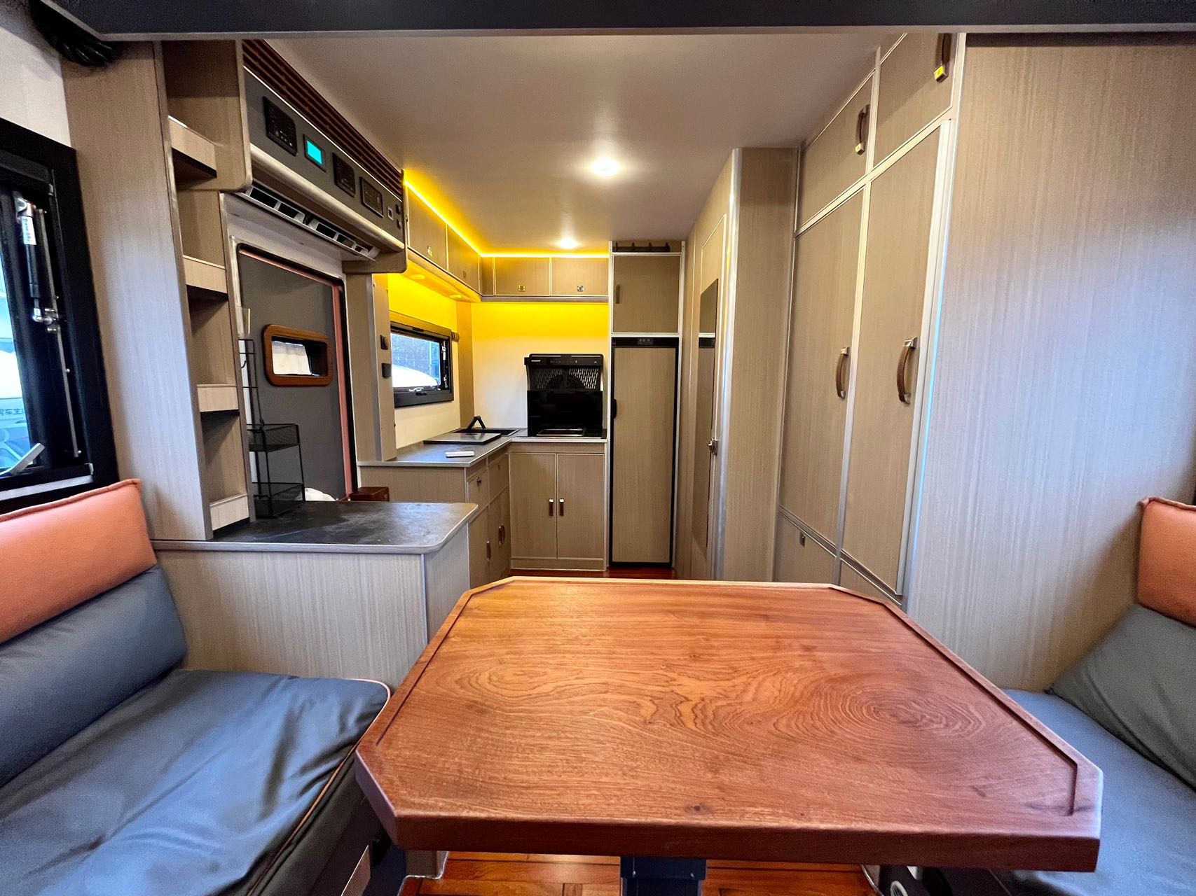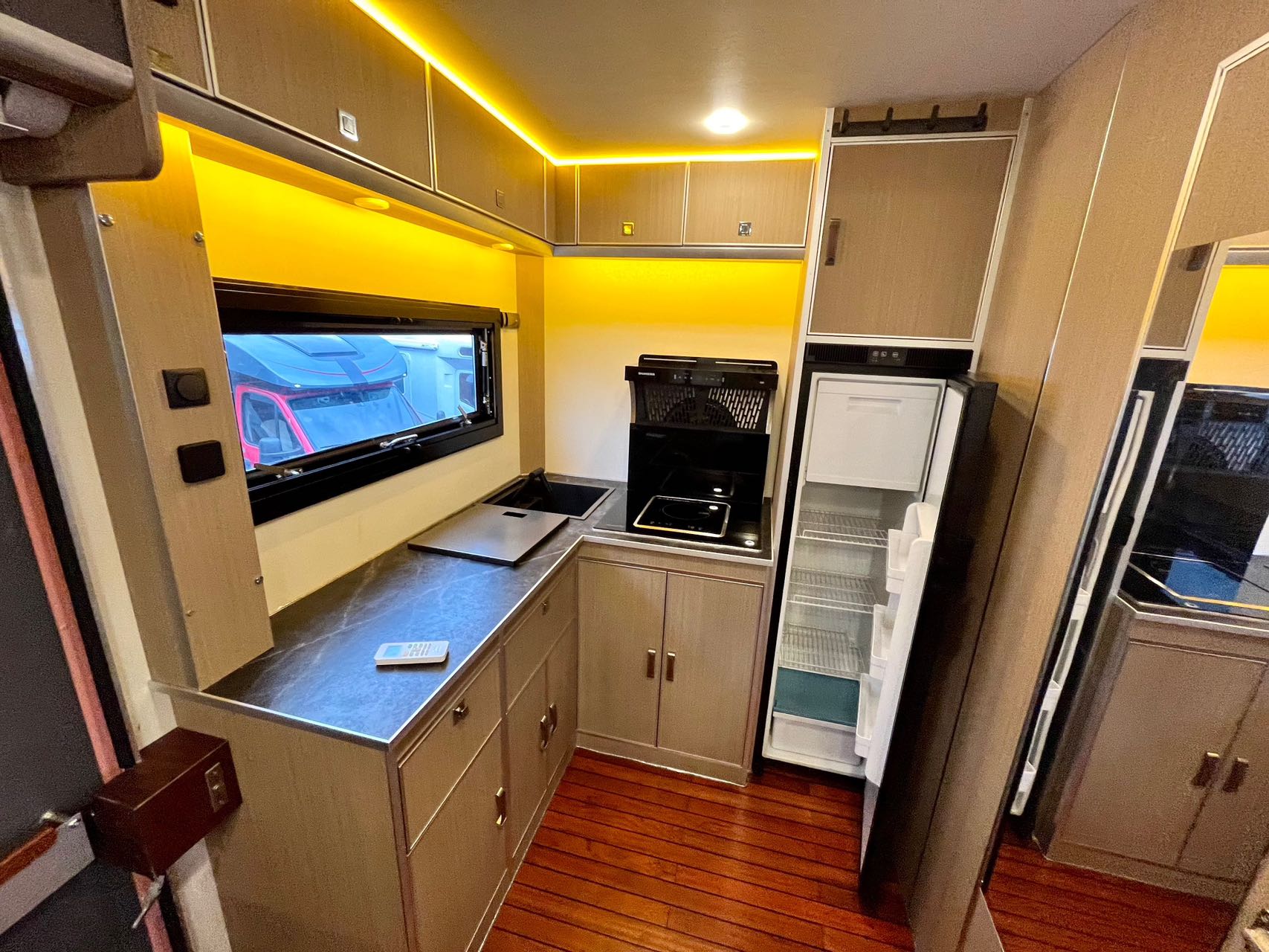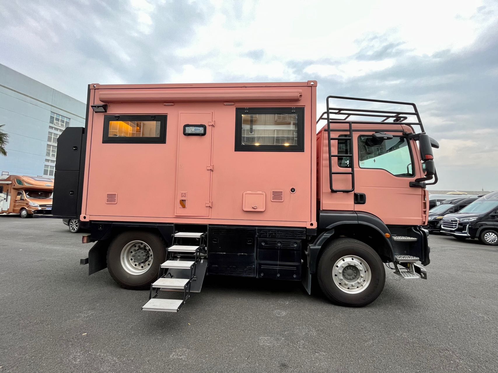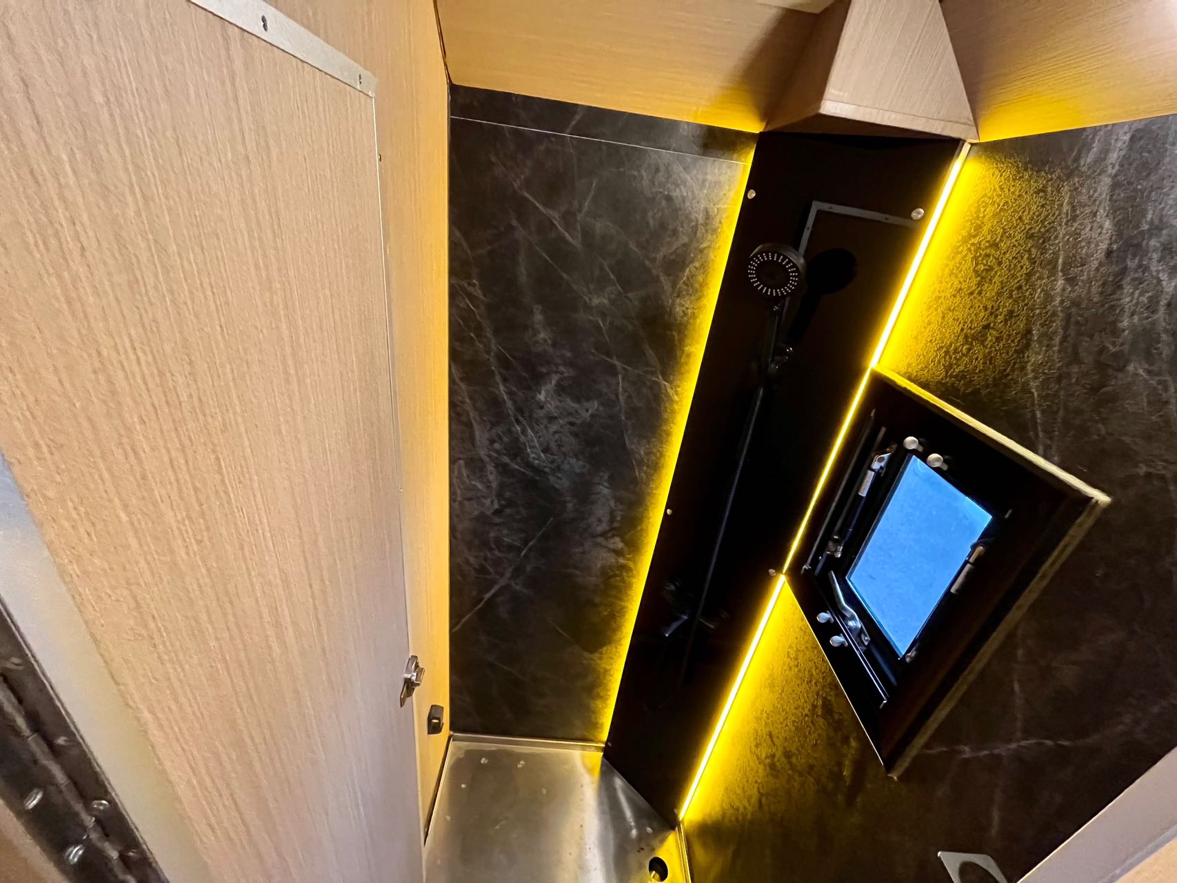【户外配置】:220V市电接口,重力加水口,电动户外遮阳棚,中门密码锁,五阶上车踏步,电动升降储物箱和摩托车架,车顶射灯