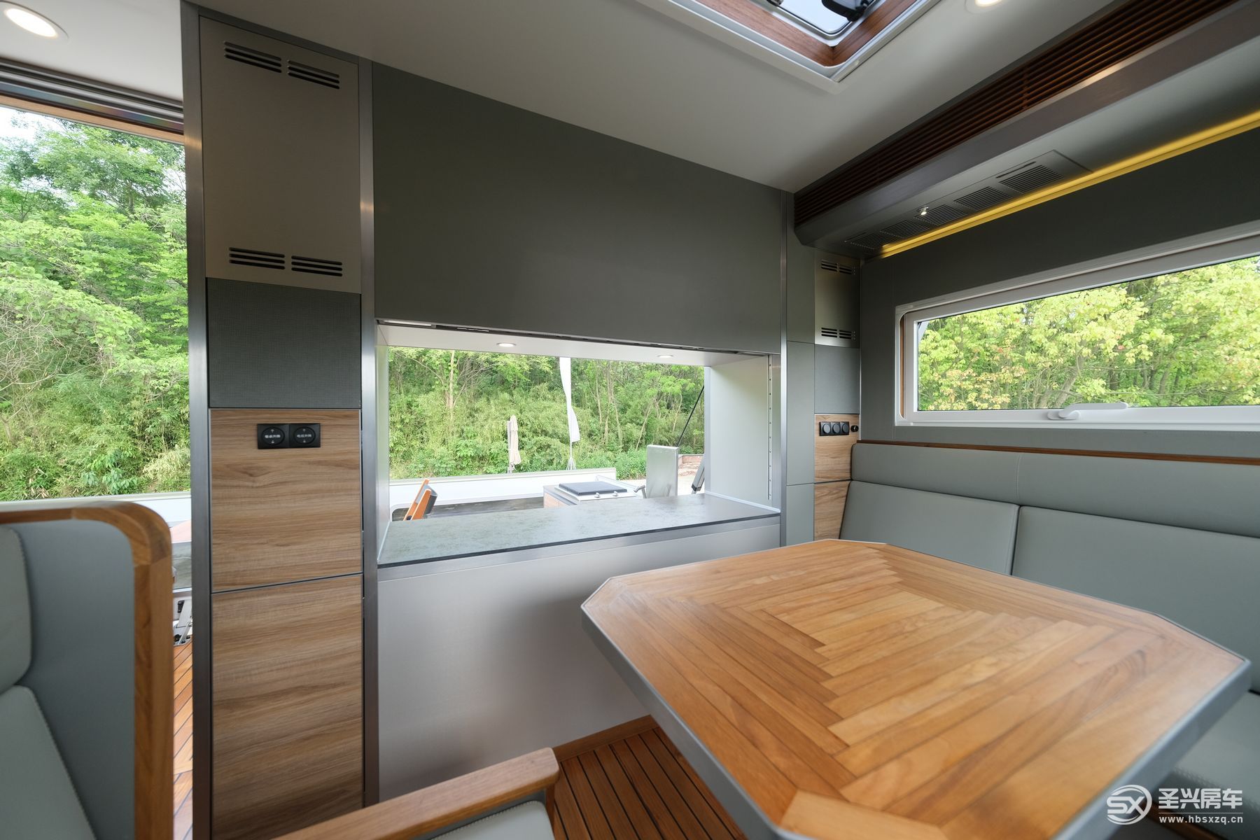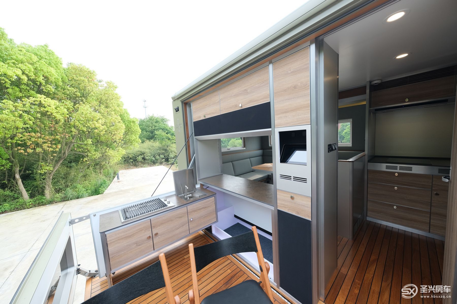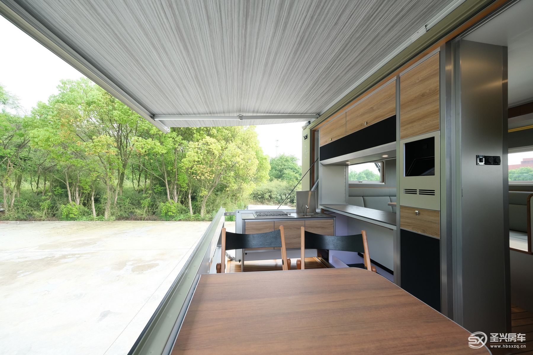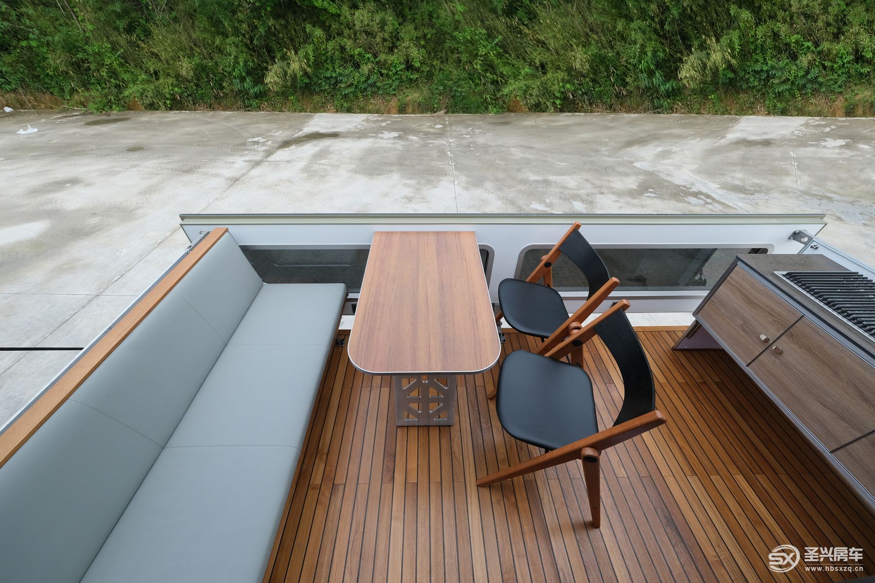 外部设施外置:厨房 遮阳棚 加水口 充电口 自行车架 爬梯架 外置淋浴 外置桌板