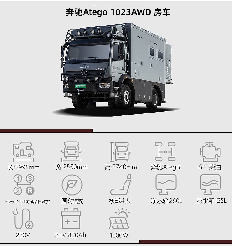 中卡房车无论从重量还是驾驶质感方面都要比重卡房车轻松灵动;而和轻卡房车相比,中卡房车在气场以及最大总质量上具有突出的表现。奔驰Atego 1023AWD底盘优势,发动机、变速箱及分时四驱等硬件方面表现突出,对于那些喜欢尝试冒险、追求更高品质的消费者无疑增添了新选择。