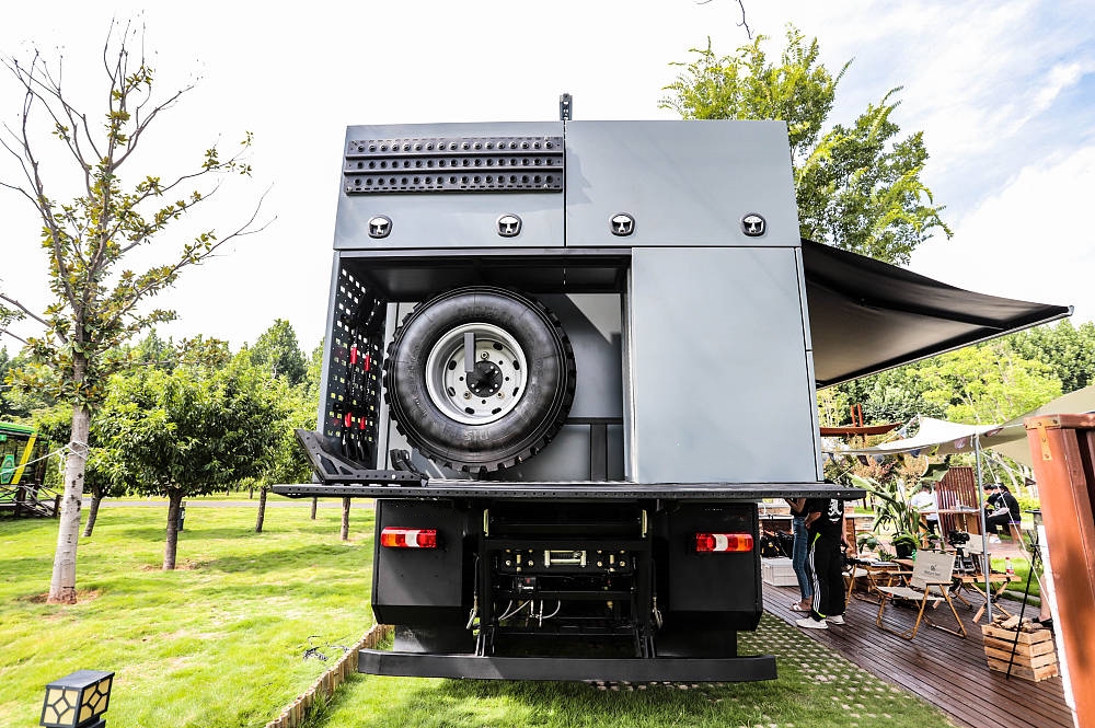 车尾部分设计了越野专用电动液压升降平台,包含多组储物舱、备胎、摩托车架等,底部设计有绞盘系统,可帮助其它车辆牵引脱困。