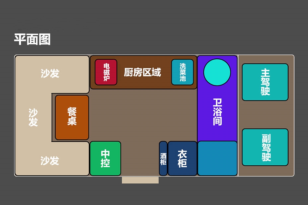 生活区内部并非常规的中卡房车布局,卫浴间设置在前部,通舱窗口直接连通卫浴间。内部布局因此变为前置卫浴间、中置厨房区、尾置会客区,新车核载人数为4人,厢体内部可乘坐2人。