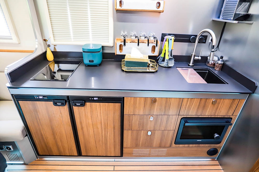 另一侧厨房区配备了非常宽裕的台面,左右两侧内嵌有德国进口电磁炉、进口水龙头、洗手池,中间位置可以当作操作台使用,满足2-3人同时在厨房区操作的诉求,台面下方分别配有蒸烤一体箱、152L分体式电冰箱,可按照需求单独控制冷冻/冷藏温度。