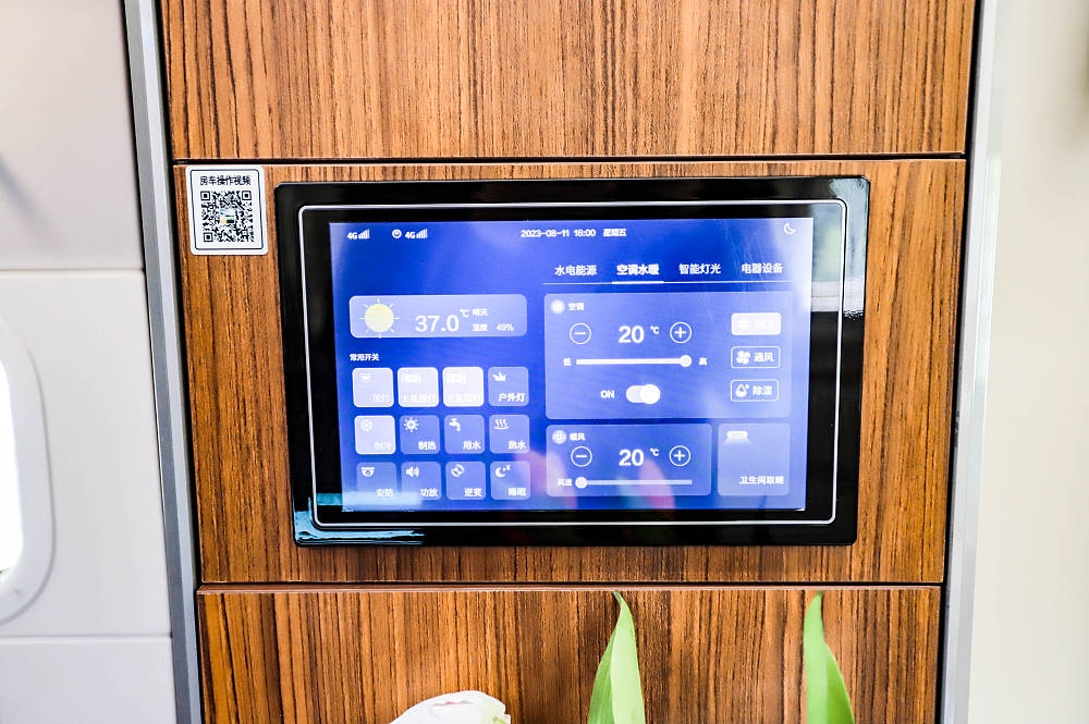 房车中门匹配了一套人脸识别系统,安防系统还包括4路监控、全彩夜视、人形识别报警等,保证车内外安全。